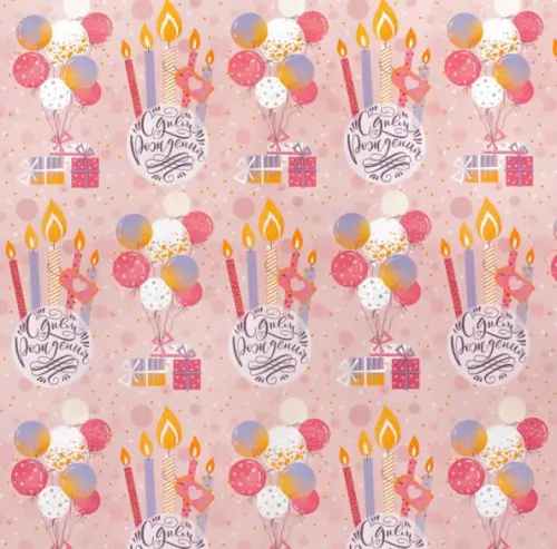 Упаковочная бумага Поздравляю для сувенирной продукции в рулонах, мелованная с двух сторон, с полноцветным декоративным рисунком.