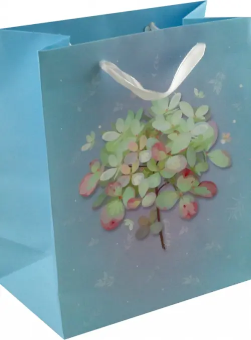 Пакет подарочный "Нежная гортензия". Пакет с прекрасной гортензией на нежно-голубом фоне станет чудесной составляющей любого подарка.