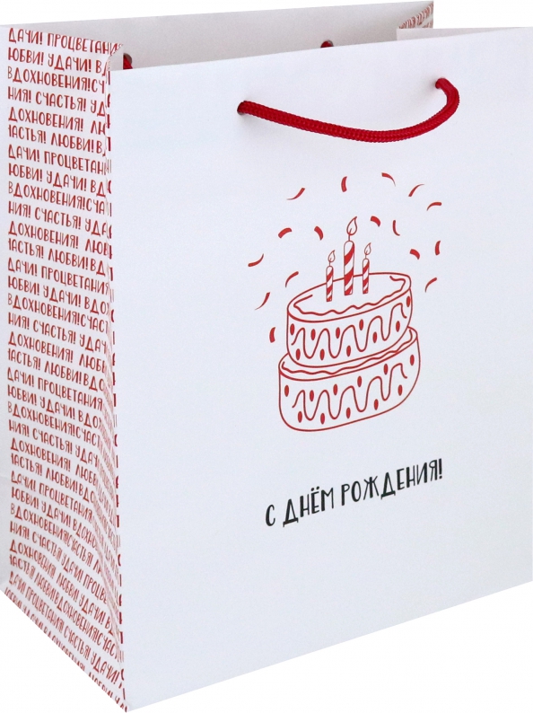Подарочный пакет с лаконичным изображением ярусного торта в насыщенном красном цвете, надписью "С днем рождения!" и пожеланиями по бокам на белом фоне подойдёт для эффектного вручения подарков любимой или любимому, жене или мужу, друзьям, коллегам на день рождения. В такой особенный праздник, как день рождения, упаковка подарка важна не меньше, чем сам презент. Минималистичный дизайн оценят как мужчины, так и женщины. Стильная упаковка идеально дополнит подарок и создаст праздничное настроение. Удобный размер М (180х227х100 мм) позволяет уложить в пакет один подарок или нескольких маленьких сувениров.