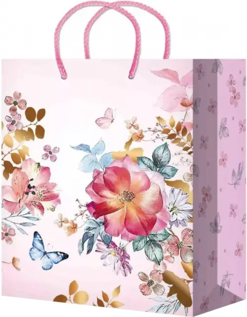 Пакет подарочный, бумажный. Матовая ламинация. Текстильные ручки в виде шнура. Размер: 110х137х60 мм.
