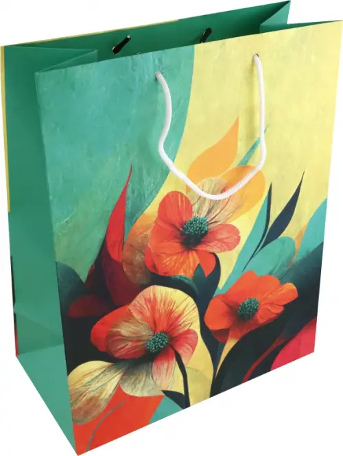 Бумажный подарочный пакет размера 26 см х 32 см, ширина дна 13 см, с яркими цветами, станет прекрасным оформлением вашего подарка. Изготовлен из матовой бумаги. Используется матовая ламинация, поэтому ваш подарочный пакет станет ярким украшением праздника. Пакет оснащен прочными белыми ручками и укрепленным дном.
