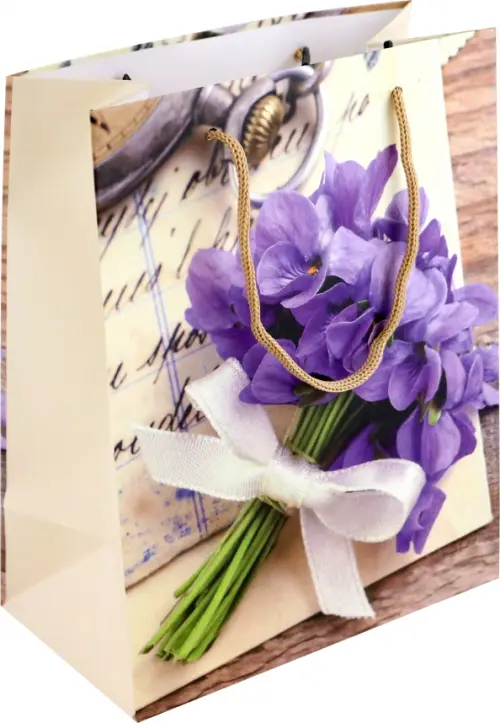 Бумажный подарочный пакет размера 18 см х 22,7 см, ширина дна 10 см, с красивыми фиалками. Изготовлен из матовой бумаги. Используется матовая ламинация, поэтому ваш подарочный пакет станет ярким украшением любого праздника.