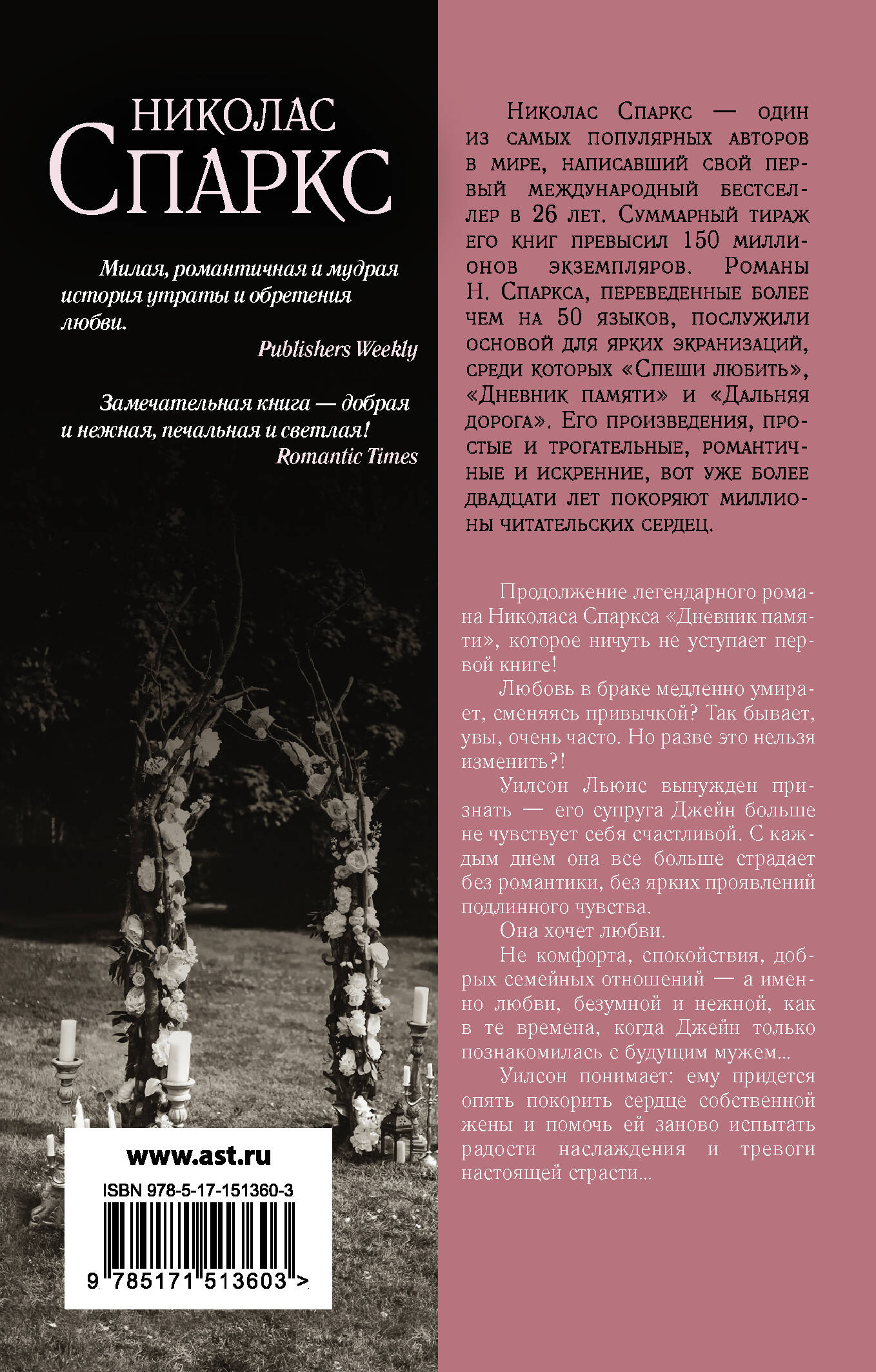 Продолжение легендарного романа Николаса Спаркса "Дневник памяти", которое ничуть не уступает первой книге! Любовь в браке медленно умирает, сменяясь привычкой? Так бывает, увы, очень часто. Но разве это нельзя изменить?! Уилсон Льюис вынужден признать - его супруга Джейн больше не чувствует себя счастливой. С каждым днем она все больше страдает без романтики, без ярких проявлений подлинного чувства. Она хочет любви. Не комфорта, спокойствия, добрых семейных отношений, - а именно любви, безумной и нежной, как в те времена, когда Джейн только познакомилась с будущим мужем… Уилсон понимает: ему придется опять покорить сердце собственной жены и помочь ей заново испытать радости, наслаждения и тревоги настоящей страсти…| Издательство | ИЗДАТЕЛЬСТВО "АСТ" |