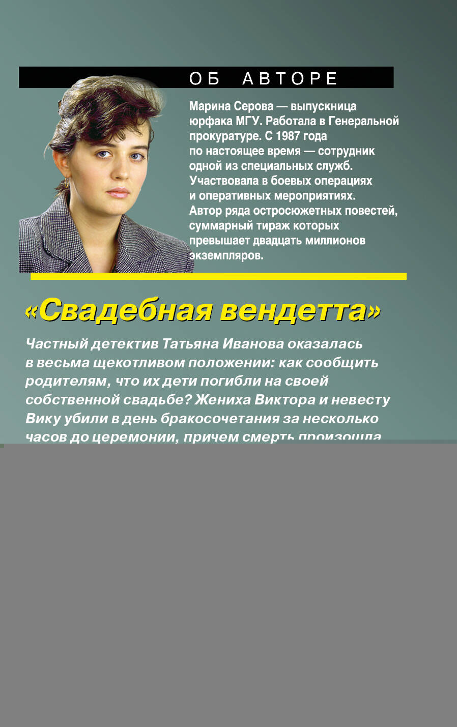 Марина Серова - феномен современного отечественного детективного жанра. Выпускница юрфака МГУ, работала в Генеральной прокуратуре. С 1987 года по настоящее время - сотрудник одной из специальных служб. Участвовала в боевых операциях и оперативных мероприятиях. Автор ряда остросюжетных повестей, суммарный тираж которых превышает двадцать миллионов экземпляров. Частный детектив Татьяна Иванова оказалась в весьма щекотливом положении - как сообщить родителям, что их дети погибли на своей собственной свадьбе. Жениха Виктора и невесту Вику убили в день бракосочетания за несколько часов до церемонии, причем смерть произошла в «Раю» - роскошном гостиничном комплексе на острове посреди реки. Полиция сможет прибыть в «Рай» только через пару часов, и за это время Татьяне нужно самой найти преступника…| Издательство | ООО "Издательство "Эксмо" |