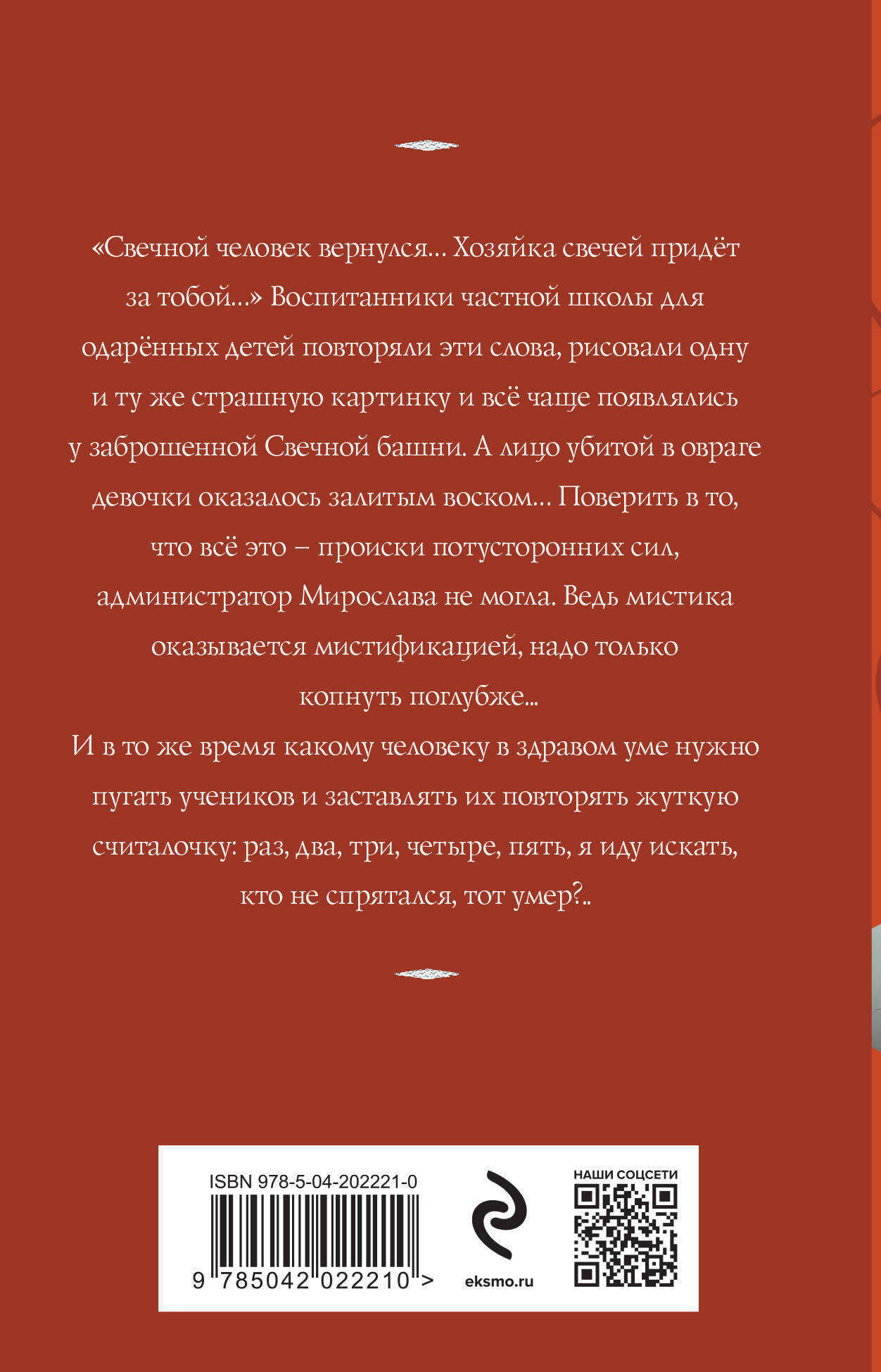 Мистический детектив, детективная мистика - как всегда у автора, синтез жанров, многообразие оттенков… Ужасные события происходят в усадьбе Горисветово - вновь, как и тринадцать лет назад, там произошло убийство ребёнка. Лицо задушенной девочки было залито воском… Тогда убийцу окрестили Свечным человеком - аналогично он поступил со всеми своими жертвами, - но найти его не смогли. И вот сейчас - тот же почерк. Или кто-то имитирует действия душегуба? Опасаясь за жизнь детей, руководство принимает усиленные меры, а администратор Мирослава Мирохина - чудом выжившая после нападения того самого убийцы - пытается восстановить подробности прошлого. Может быть, так можно выйти на нынешнего убийцу? У нее находятся помощники. А также те, которые пытаются ей помешать…| Издательство | ООО "Издательство "Эксмо" |