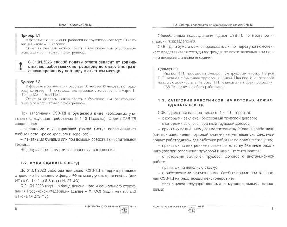 Практическое пособие по заполнению формы СЗВ-ТД на все случаи жизни. Приведены примеры заполнения СЗВ-ТД при кадровых мероприятиях в отношении различных категорий работников: директора, совместителя, вахтовика и т.д. Рассмотрены алгоритмы действий в сложных ситуациях: например, кто и когда должен отправить первый отчет при создании новой организации, а также кто и когда сдает последний отчет при увольнении в связи с ликвидацией организации. Предназначено для кадровых работников, бухгалтеров и руководителей организаций всех форм собственности.| Издательство | АйСи Групп |