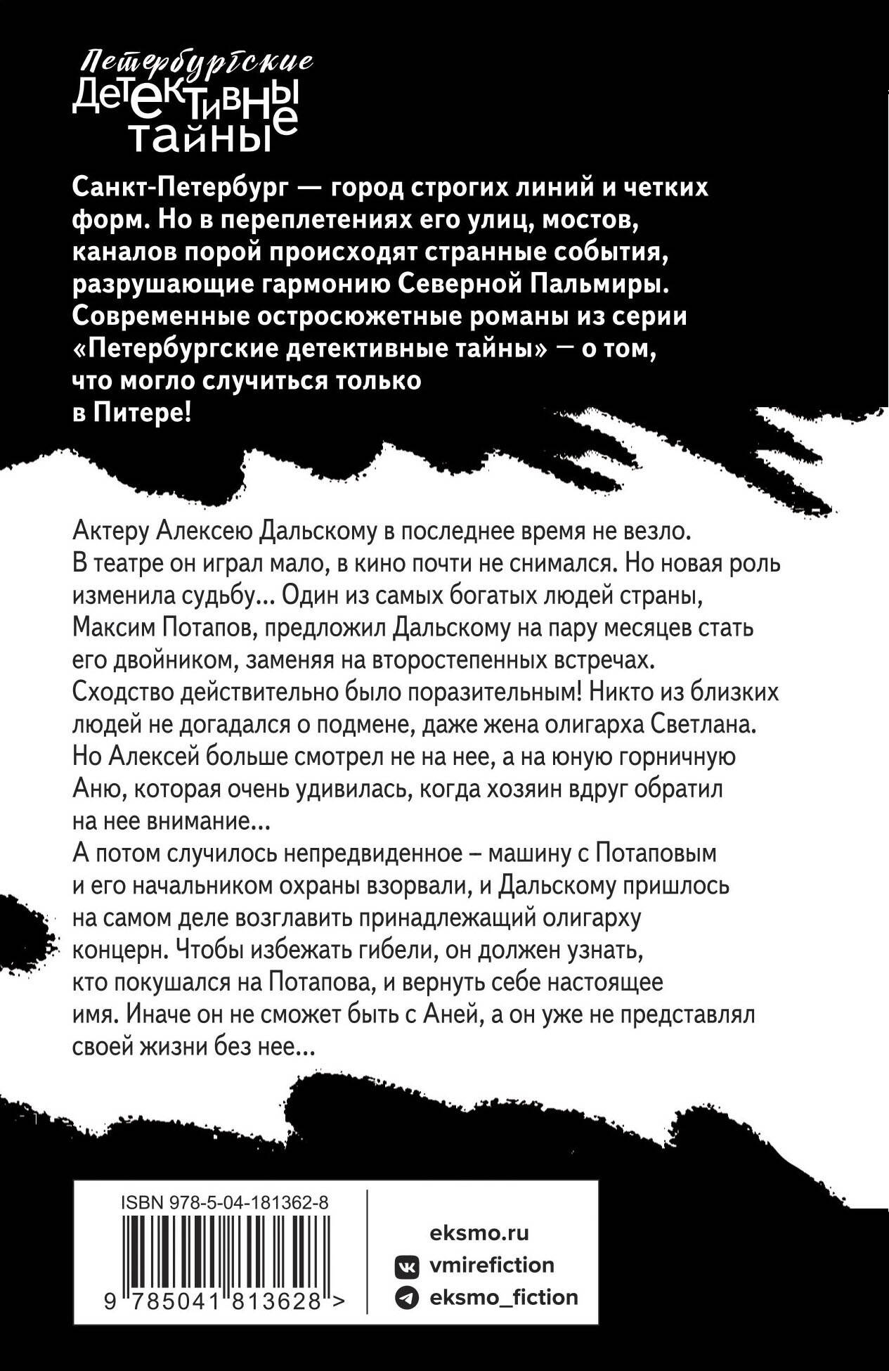 Актеру Алексею Дальскому в последнее время не везло. В театре он играл мало, в кино почти не снимался. Но новая роль изменила судьбу... Один из самых богатых людей страны, Максим Потапов, предложил Дальскому на пару месяцев стать его двойником, заменяя на второстепенных встречах. Сходство действительно было поразительным! Никто из близких людей не догадался о подмене, даже жена олигарха Светлана. Но Алексей больше смотрел не на нее, а на юную горничную Аню, которая очень удивилась, когда хозяин вдруг обратил на нее внимание… А потом случилось непредвиденное - машину с Потаповым и его начальником охраны взорвали, и Дальскому пришлось на самом деле возглавить принадлежащий олигарху концерн. Чтобы избежать гибели, он должен узнать, кто покушался на Потапова, и вернуть себе настоящее имя. Иначе он не сможет быть с Аней, а он уже не представлял своей жизни без нее… Татьяна Устинова рекомендует: «Островская играет жизнями, тасует героев, заставляет их совершать неожиданные и странные поступки, а читателя - с замиранием сердца следить за ними и гадать: сработает, не сработает, выберутся, не выберутся!.. Сюжет то и дело поворачивает в какую-то другую сторону и на полной скорости несется дальше. Это почти невозможно, но ей удается удержаться на этих виражах!.. И очень хочется, чтобы у героев все получилось!.. И финал! Он всегда феерический, во всех отношениях».| Издательство | ООО "Издательство "Эксмо" |