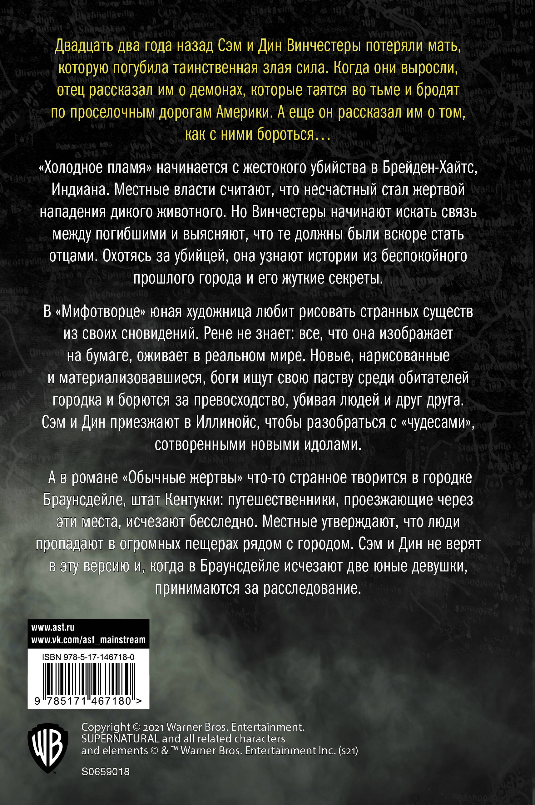 Двадцать два года назад Сэм и Дин Винчестеры потеряли мать, которую погубила таинственная злая сила.Когда они выросли, отец рассказал им о демонах, который таятся во тьме и бродят по проселочным дорогам Америки. А еще он рассказал им о том, как с ними бороться. "Холодное пламя" начинается с жестокого убийства в Брейден-Хайтс, Индиана. Местные власти считают, что несчастный стал жертвой нападения дикого животного. Но Винчестеры начинают искать связь между погибшими и выясняют, что те должны были вскоре стать отцами. Охотясь за убийцей, она узнают истории из беспокойного прошлого города и его жуткие секреты. В "Мифотворце" юная художница любит рисовать странных существ из своих сновидений. Рене не знает: все, что она изображает на бумаге, оживает в реальном мире. Новые, нарисованные и материализовавшиеся боги ищут свою паству среди обитателей городка и борются за превосходство, убивая людей и друг друга. Сэм и Дин приезжают в Иллинойс, чтобы разобраться с "чудесами", сотворенными новыми идолами. А в романе "Обычные жертвы" что-то странное творится в городке Браунсдейл, штат Кентукки: путешественники, проезжающие через эти места, исчезают бесследно. Местные утверждают, что люди пропадают в огромных пещерах рядом с городом. Сэм и Дин не верят в эту версию, и когда в Браунсдейле изают две юные девушки, принимаются за расследование.| Издательство | ИЗДАТЕЛЬСТВО "АСТ" |
