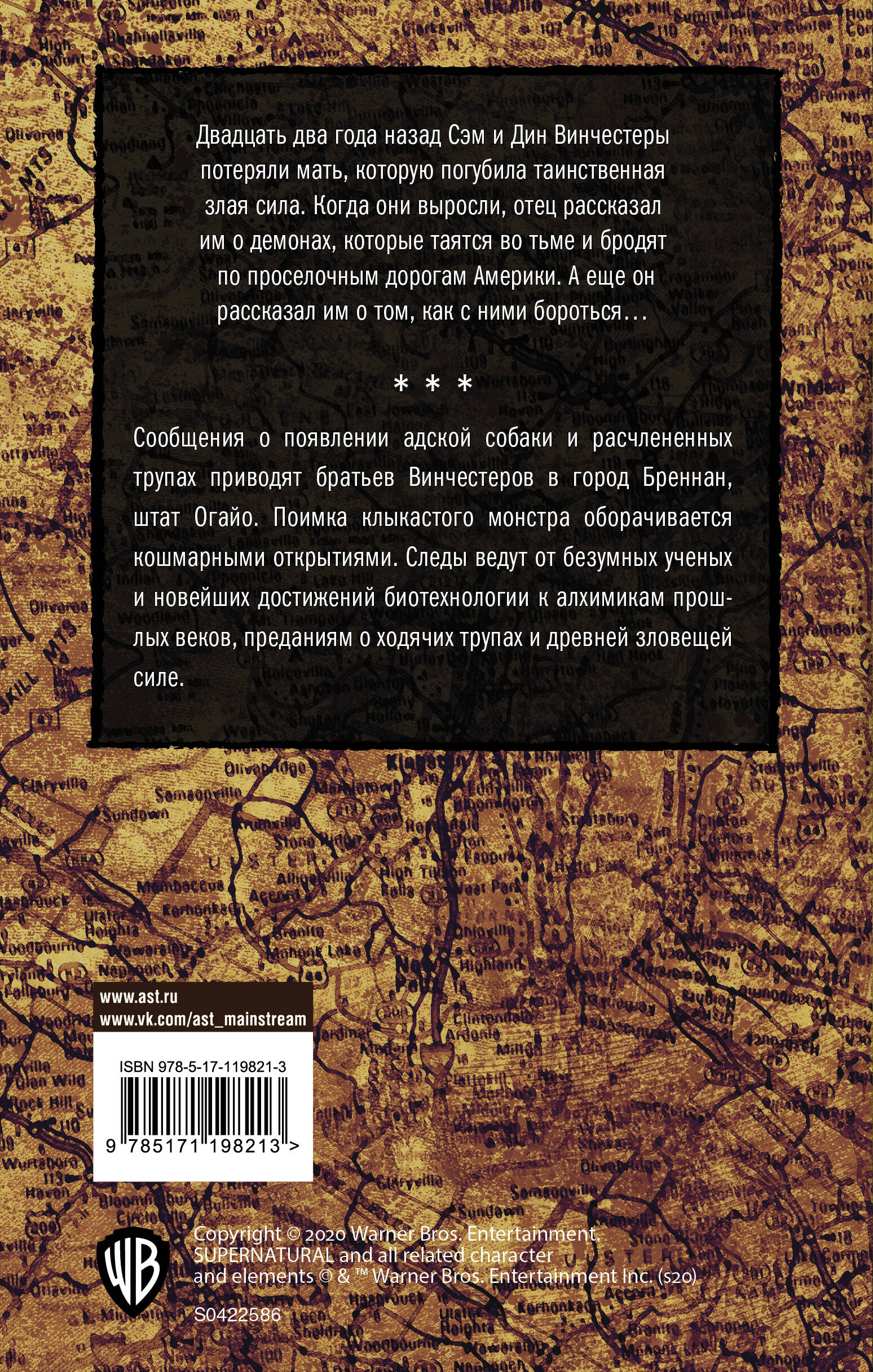 Двадцать два года назад Сэм и Дин Винчестеры потеряли мать, которую погубила таинственная злая сила. Когда они выросли, отец рассказал им о демонах, которые таятся во тьме и бродят по проселочным дорогам Америки. А еще он рассказал им о том, как с ними бороться… Cообщения о появлении адской собаки и расчлененных трупах приводят братьев Винчестеров в город Бреннан, штат Огайо. Поимка клыкастого монстра оборачивается кошмарными открытиями. Следы ведут от безумных ученых и новейших достижений биотехнологии к алхимикам прошлых веков, преданиям о ходячих трупах и древней зловещей силе.| Издательство | ИЗДАТЕЛЬСТВО "АСТ" |