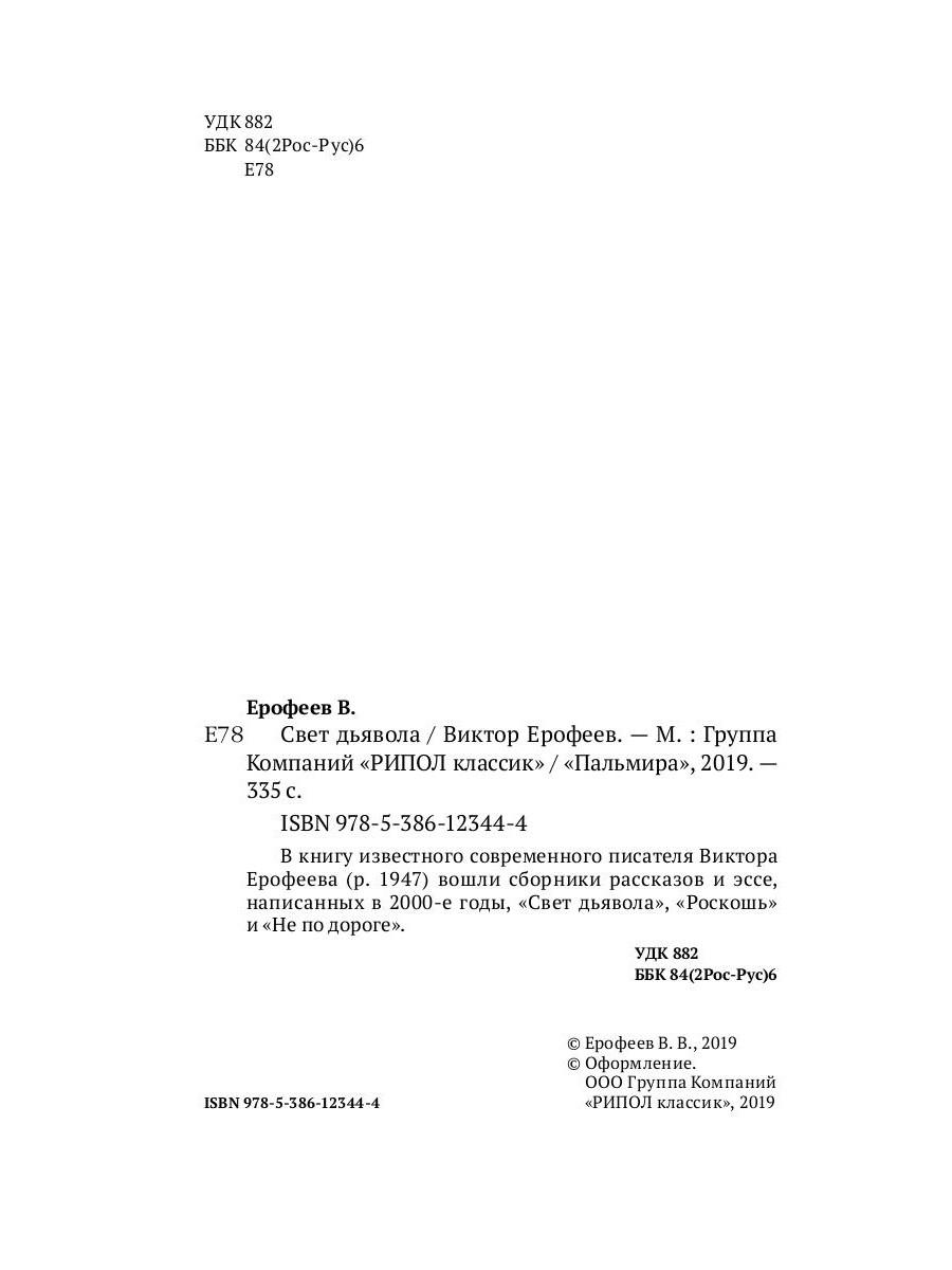 В книгу известного современного писателя Виктора Ерофеева (р. 1947) вошли сборники рассказов и эссе, написанных в 2000-е годы, «Свет дьявола», «Роскошь» и «Не по дороге».| Издательство | Рипол Классик |