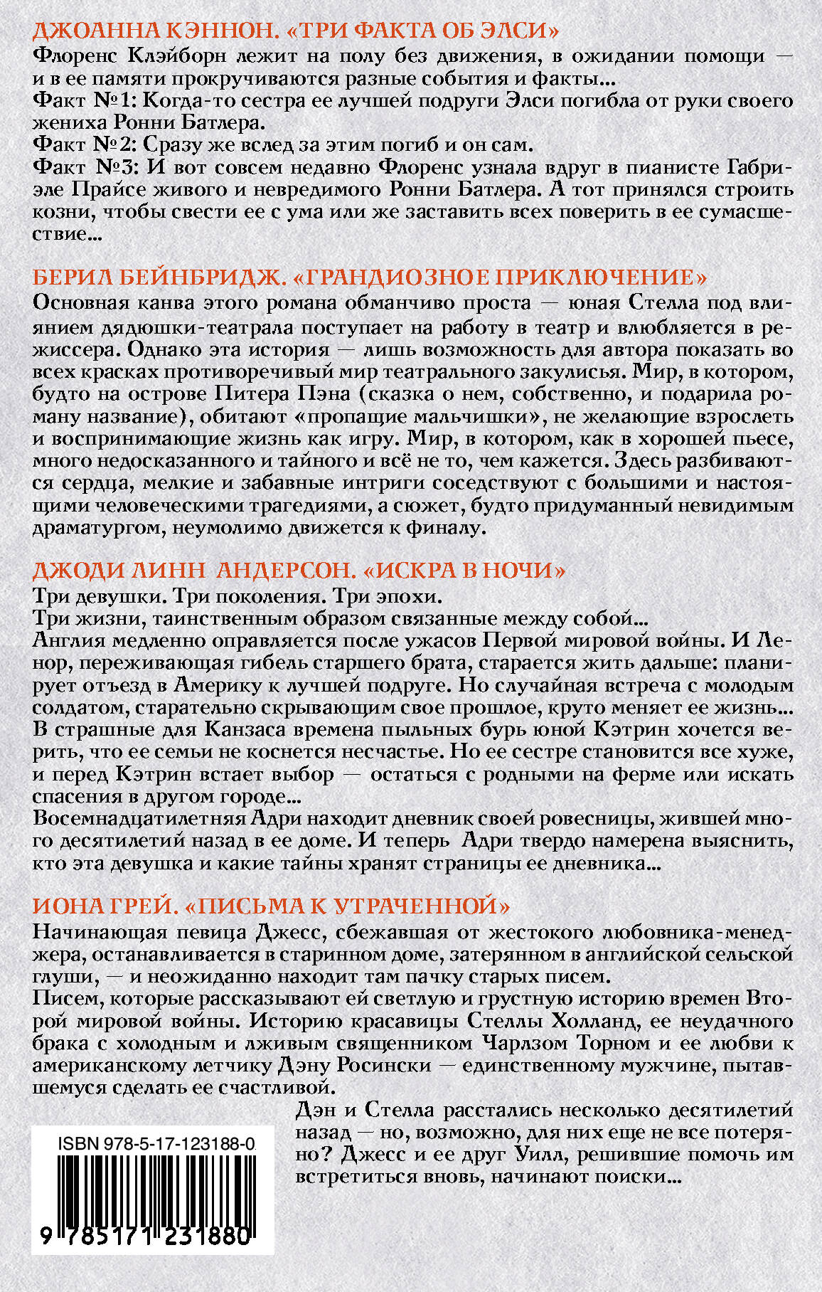 Джоанна Кэннон. "Три факта об Элси" Флоренс Клэйборн лежит на полу без движения, в ожидании помощи - и в ее памяти прокручиваются разные события и факты... Факт №1: Когда-то сестра ее лучшей подруги Элси погибла от руки своего жениха Ронни Батлера. Факт №2: Сразу же вслед за этим погиб и он сам. Факт №3: И вот совсем недавно Флоренс узнала вдруг в пианисте Габриэле Прайсе живого и невредимого Ронни Батлера. А тот принялся строить козни, чтобы свести ее с ума или же заставить всех поверить в ее сумасшествие… Берил Бейнбридж. "Грандиозное приключение" Основная канва этого романа обманчиво проста - юная Стелла под влиянием дядюшки-театрала поступает на работу в театр и влюбляется в режиссера. Однако эта история - лишь возможность для автора показать во всех красках противоречивый мир театрального закулисья. Мир, в котором, будто на острове Питера Пэна (сказка о нем, собственно, и подарила роману название), обитают "пропащие мальчишки", не желающие взрослеть и воспринимающие жизнь как игру. Мир, в котором, как в хорошей пьесе, много недосказанного и тайного и всё не то, чем кажется. Здесь разбиваются сердца, мелкие и забавные интриги соседствуют с большими и настоящими человеческими трагедиями, а сюжет, будто придуманный невидимым драматургом, неумолимо движется к финалу. Джоди Линн Андерсон. "Искра в ночи" Три девушки. Три поколения. Три эпохи. Три жизни, таинственным образом связанные между собой… Англия медленно оправляется после ужасов Первой мировой войны. И Ленор, переживающая гибель старшего брата, старается жить дальше: планирует отъезд в Америку к лучшей подруге. Но случайная встреча с молодым солдатом, старательно скрывающим свое прошлое, круто меняет ее жизнь... В страшные для Канзаса времена пыльных бурь юной Кэтрин хочется верить, что ее семьи не коснется несчастье. Но ее сестре становится все хуже, и перед Кэтрин встает выбор - остаться с родными на ферме или искать спасения в другом городе… Восемнадцатилетняя Адри находит дневник своей ровесницы, жившей много десятилетий назад в ее доме. И теперь Адри твердо намерена выяснить, кто эта девушка и какие тайны хранят страницы ее дневника… Иона Грей. "Письма к утраченной" Начинающая певица Джесс, сбежавшая от жестокого любовника-менеджера, останавливается в старинном доме, затерянном в английской сельской глуши, - и неожиданно находит там пачку старых писем. Писем, которые рассказывают ей светлую и грустную историю времен Второй мировой войны. Историю красавицы Стеллы Холланд, ее неудачного брака с холодным и лживым священником Чарлзом Торном и ее любви к американскому летчику Дэну Росински - единственному мужчине, пытавшемуся сделать ее счастливой. Дэн и Стелла расстались несколько десятилетий назад - но, возможно, для них еще не все потеряно? Джесс и ее друг Уилл, решившие помочь им встретиться вновь, начинают поиски…| Издательство | ИЗДАТЕЛЬСТВО "АСТ" |