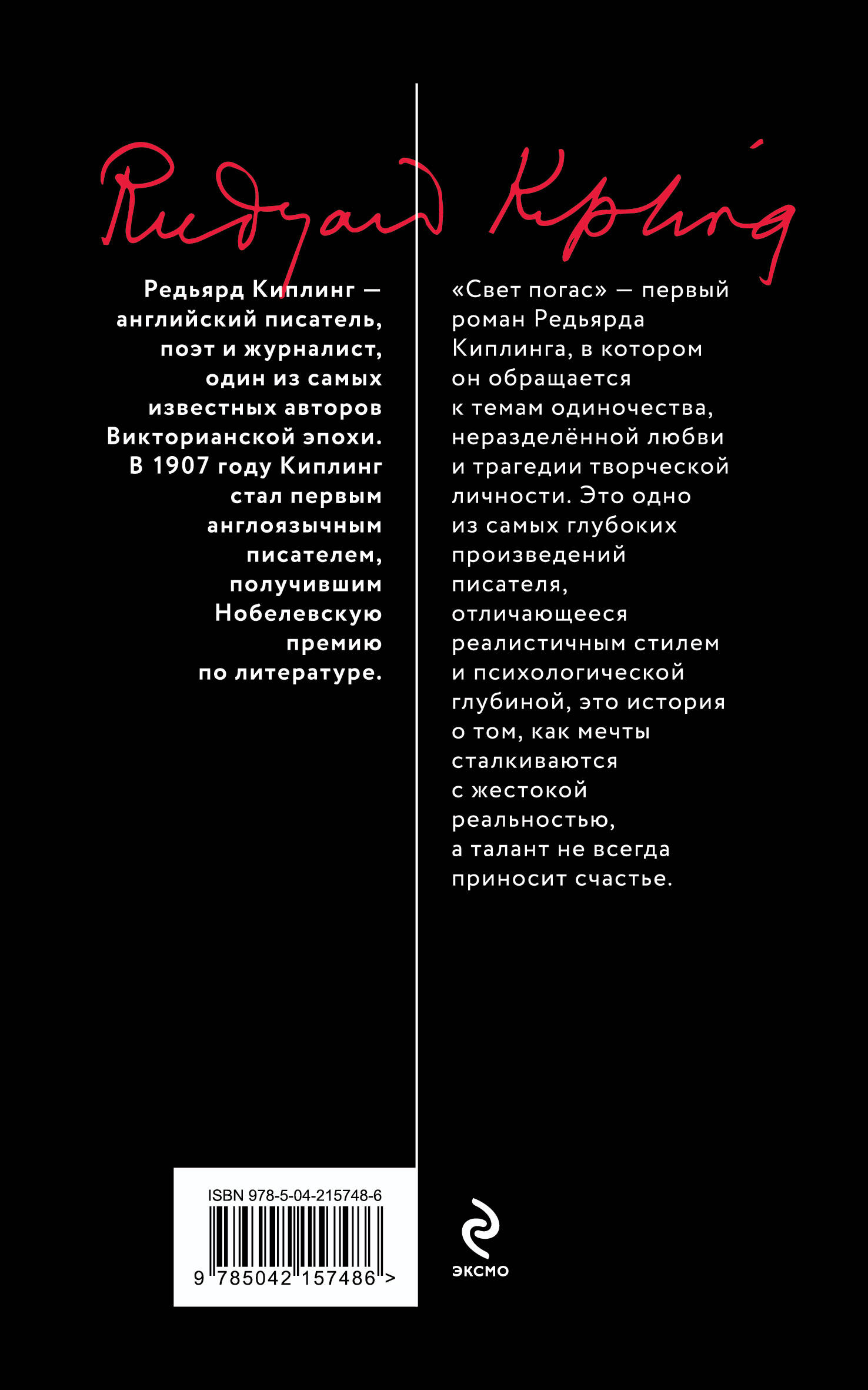 Редьярд Киплинг - английский писатель, поэт и журналист, один из самых известных авторов викторианской эпохи. В 1907 году Киплинг стал первым англоязычным писателем, получившим Нобелевскую премию по литературе. Его творчество оказало влияние на писателей XX века, таких как Джордж Оруэлл и Грэм Грин. Киплинг остаётся актуальным благодаря своим глубоким сюжетам, красочному языку и умению рассказывать истории, в которых каждый может найти что-то важное для себя. "Свет погас" - первый роман Редьярда Киплинга, в котором он обращается к темам одиночества, неразделённой любви и трагедии творческой личности. Это одно из самых глубоких произведений писателя, отличающееся реалистичным стилем и психологической глубиной - это история о том, как мечты сталкиваются с жестокой реальностью, а талант не всегда приносит счастье.| Издательство | ООО "Издательство "Эксмо" |