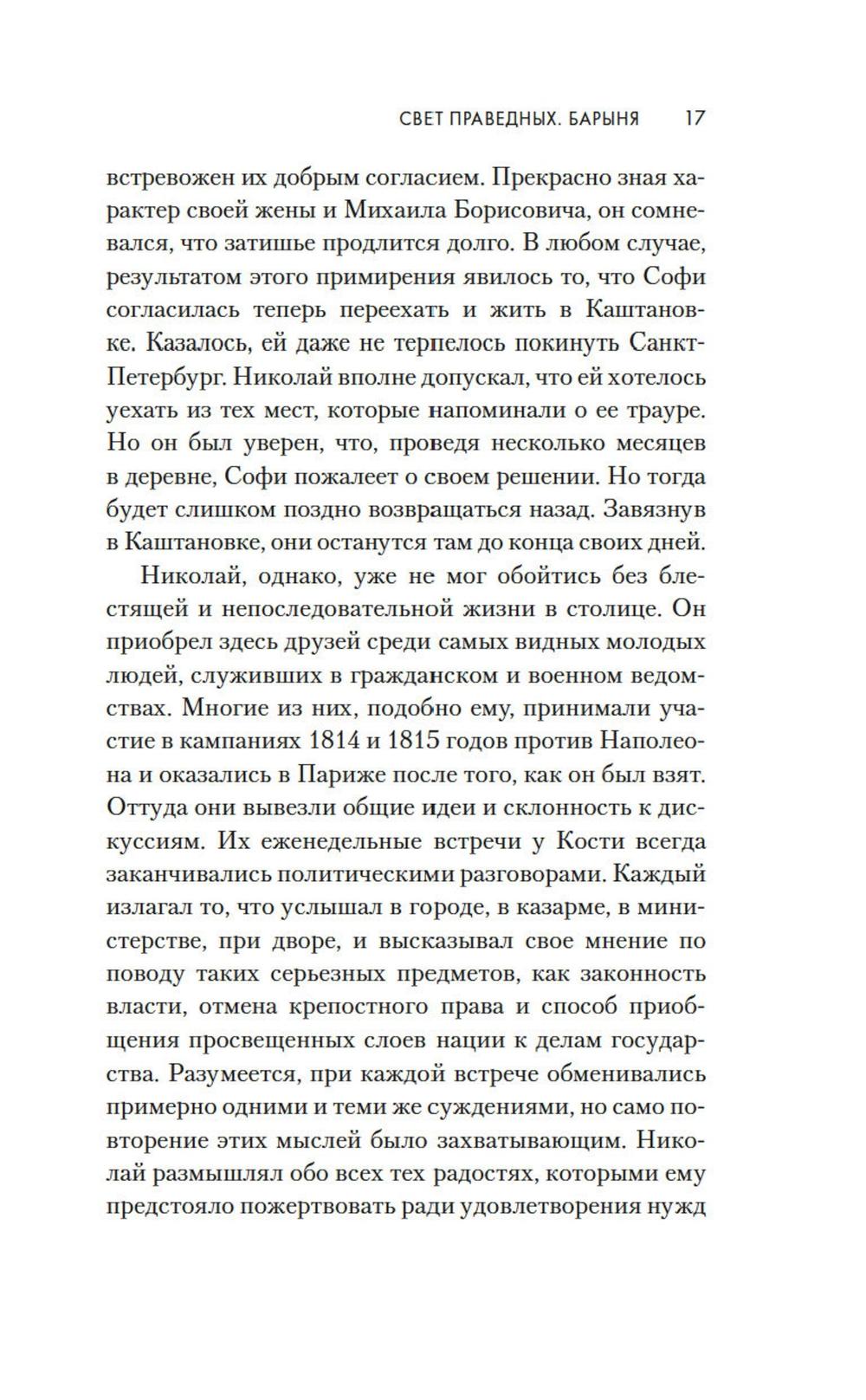 Поручик Николай Озарёв возвращается после заграничного похода в Россию не один. Во Франции он без ума влюбляется в красавицу Софи де Шамплит - умную, самостоятельную, резкую в суждениях, к тому же республиканку и добивается ее руки и сердца. Софи многого не понимает и не принимает в российской жизни, и прежде всего ей кажется чудовищным, что здесь все еще существует рабство. Она пытается облегчить жизнь крепостных, к неудовольствию свекра. Но даже на него, деспотичного, брюзгливого старика, действует очарование Софи, ее обаяние, красота, готовность помочь каждому, кто нуждается в ее участии. Но ее собственному горю помочь не может никто - они с Николаем потеряли первенца, и пережить это непросто. Между тем в России неспокойно - вернувшиеся из заграничного похода офицеры впитали идеалы свободы, равенства, братства и не хотят их забывать. Близится 1825 год.| Издательство | КоЛибри |