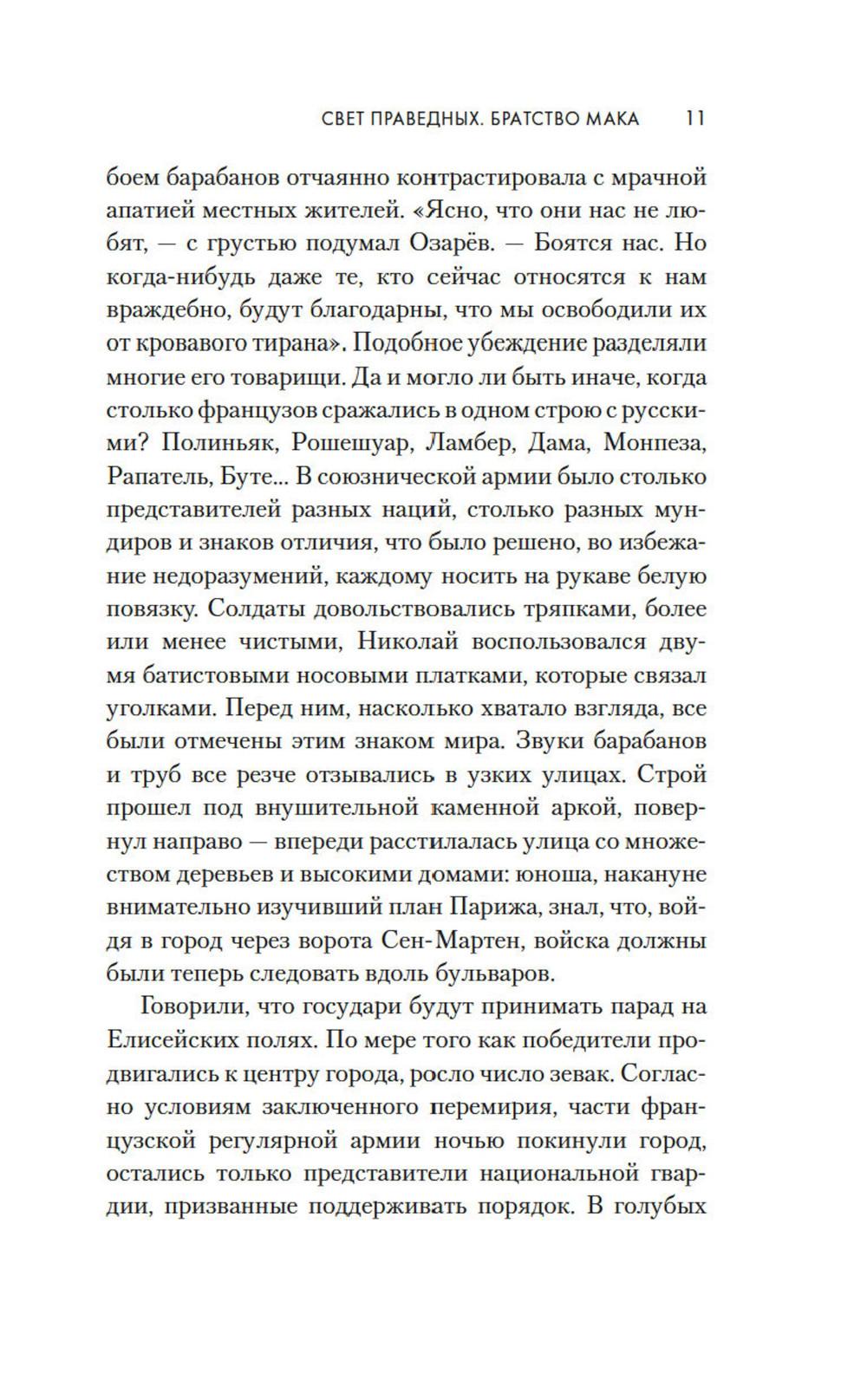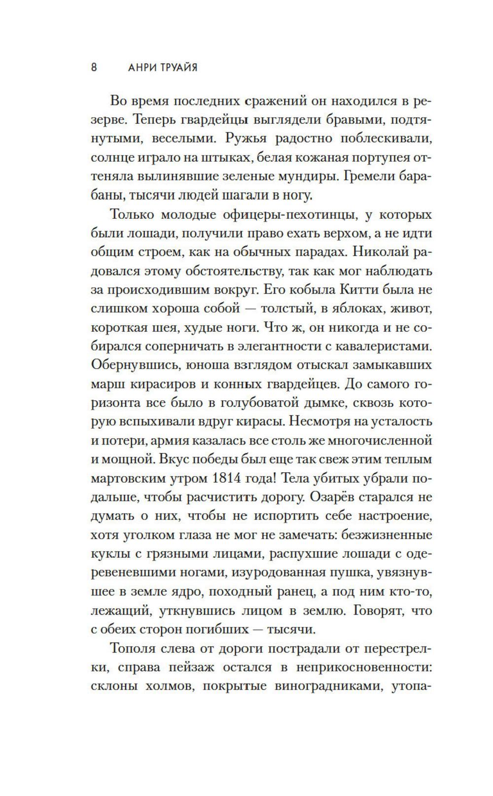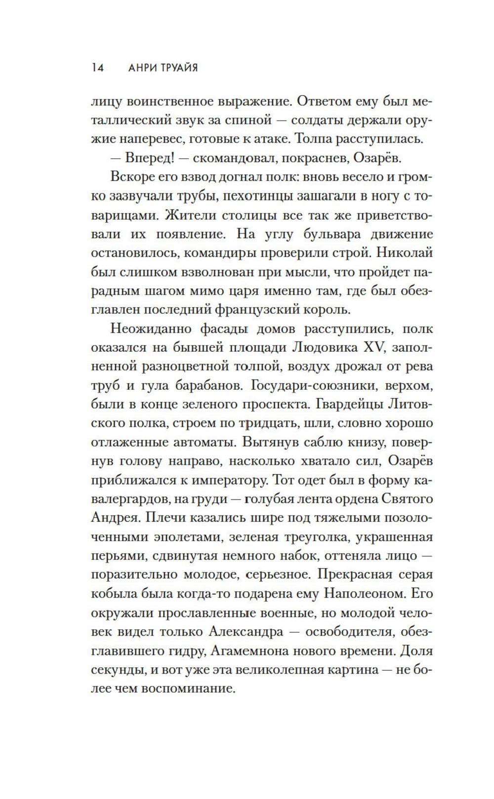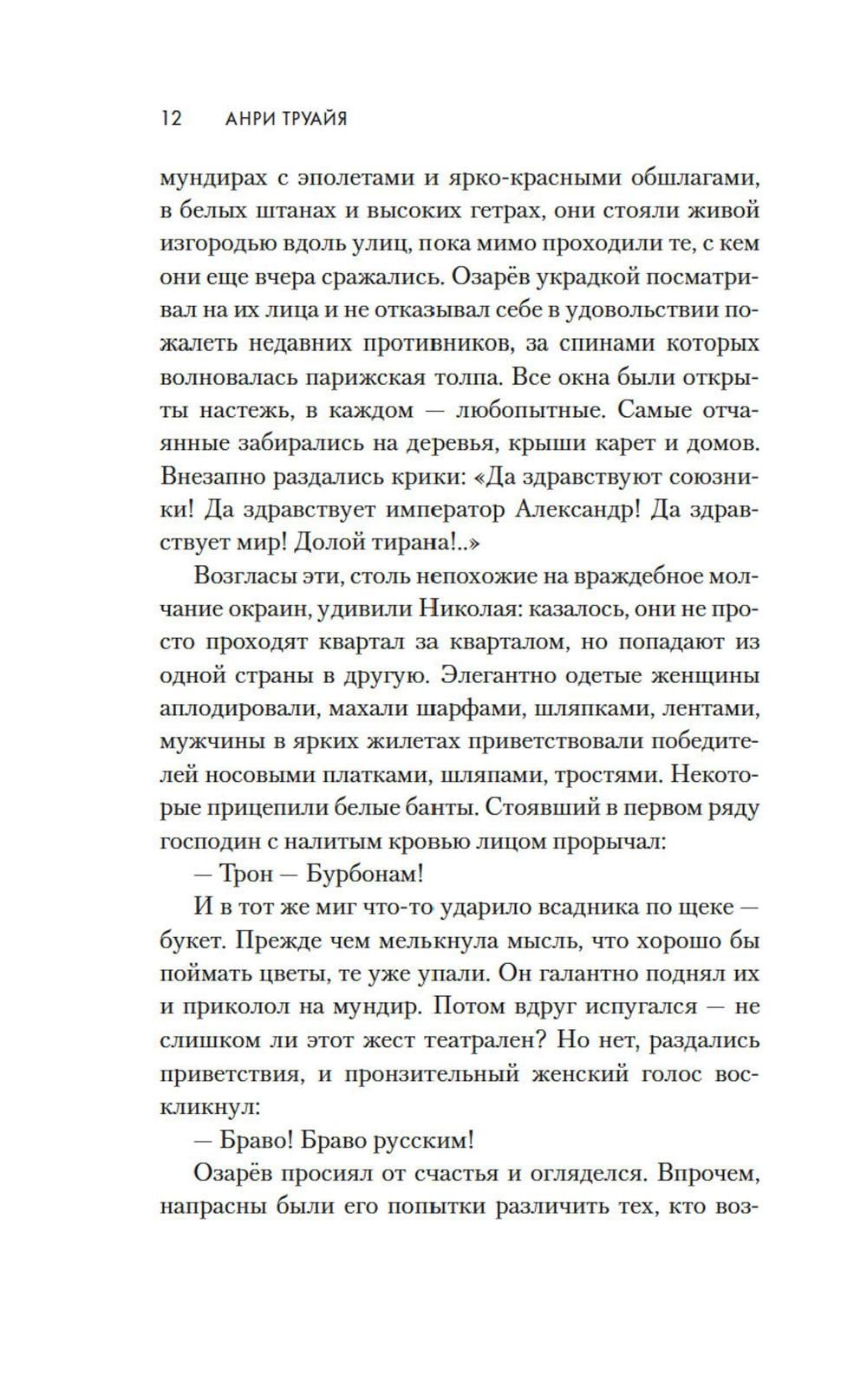 1814 год. Бонапарт повержен, русская армия победно входит в Париж. Здесь потрясающе красиво все: улицы, проспекты, соборы и площади. И еще - здесь потрясающе красивые женщины. Поручик Николай Озарёв поражен всем увиденным. Но главное впереди - он знакомится с Софи де Шамплит. Гордая, свободолюбивая красавица носит траур по умершему мужу и не сразу принимает знаки внимание русского офицера, сражавшегося против французской армии. Но в конце концов ему удается завоевать ее сердце. Николай клянется, что Софи ни разу не пожалеет о том, что доверила ему свою судьбу. И ни разу не пожалеет, что согласилась уехать с ним в далекую, незнакомую Россию. Так они оказываются в Санкт-Петербурге - холодном, величественном, но для Софи чужом городе. И это только первая часть их романа - и первая часть цикла Анри Труайя, чей цикл «Свет праведных», посвященный декабристам написан с большой любовью к российской истории и большой любовью к героям, прототипы которых и совершали эту историю.| Издательство | Азбука |