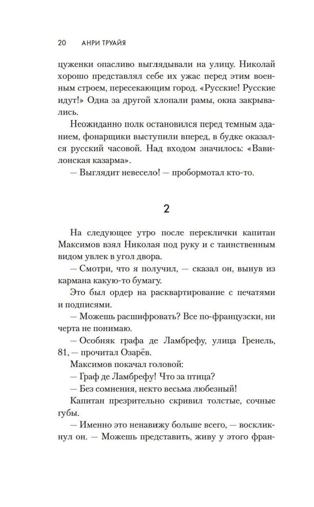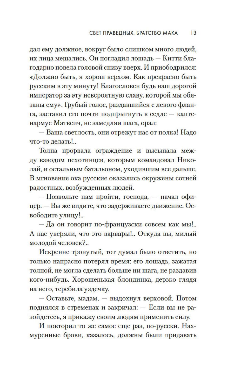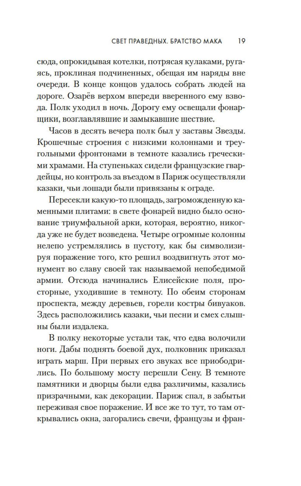 1814 год. Бонапарт повержен, русская армия победно входит в Париж. Здесь потрясающе красиво все: улицы, проспекты, соборы и площади. И еще - здесь потрясающе красивые женщины. Поручик Николай Озарёв поражен всем увиденным. Но главное впереди - он знакомится с Софи де Шамплит. Гордая, свободолюбивая красавица носит траур по умершему мужу и не сразу принимает знаки внимание русского офицера, сражавшегося против французской армии. Но в конце концов ему удается завоевать ее сердце. Николай клянется, что Софи ни разу не пожалеет о том, что доверила ему свою судьбу. И ни разу не пожалеет, что согласилась уехать с ним в далекую, незнакомую Россию. Так они оказываются в Санкт-Петербурге - холодном, величественном, но для Софи чужом городе. И это только первая часть их романа - и первая часть цикла Анри Труайя, чей цикл «Свет праведных», посвященный декабристам написан с большой любовью к российской истории и большой любовью к героям, прототипы которых и совершали эту историю.| Издательство | Азбука |