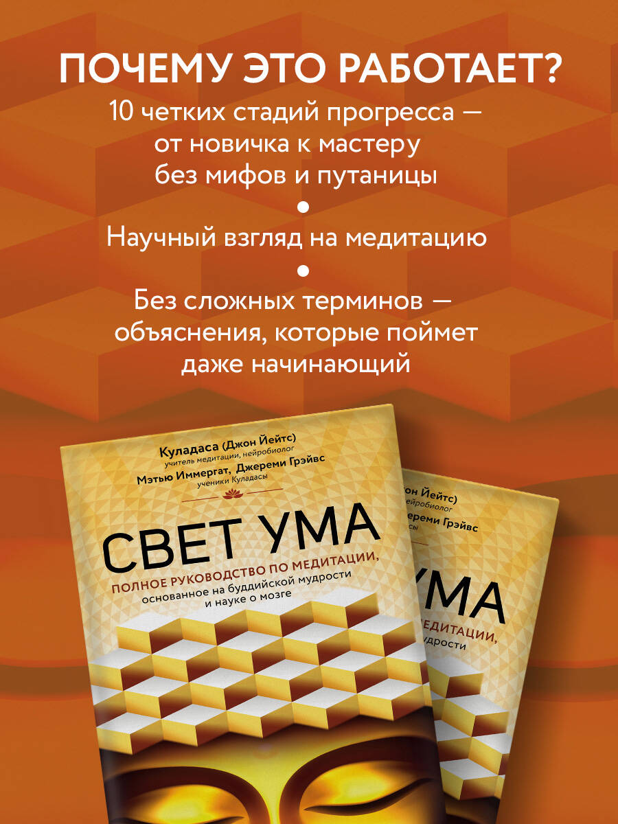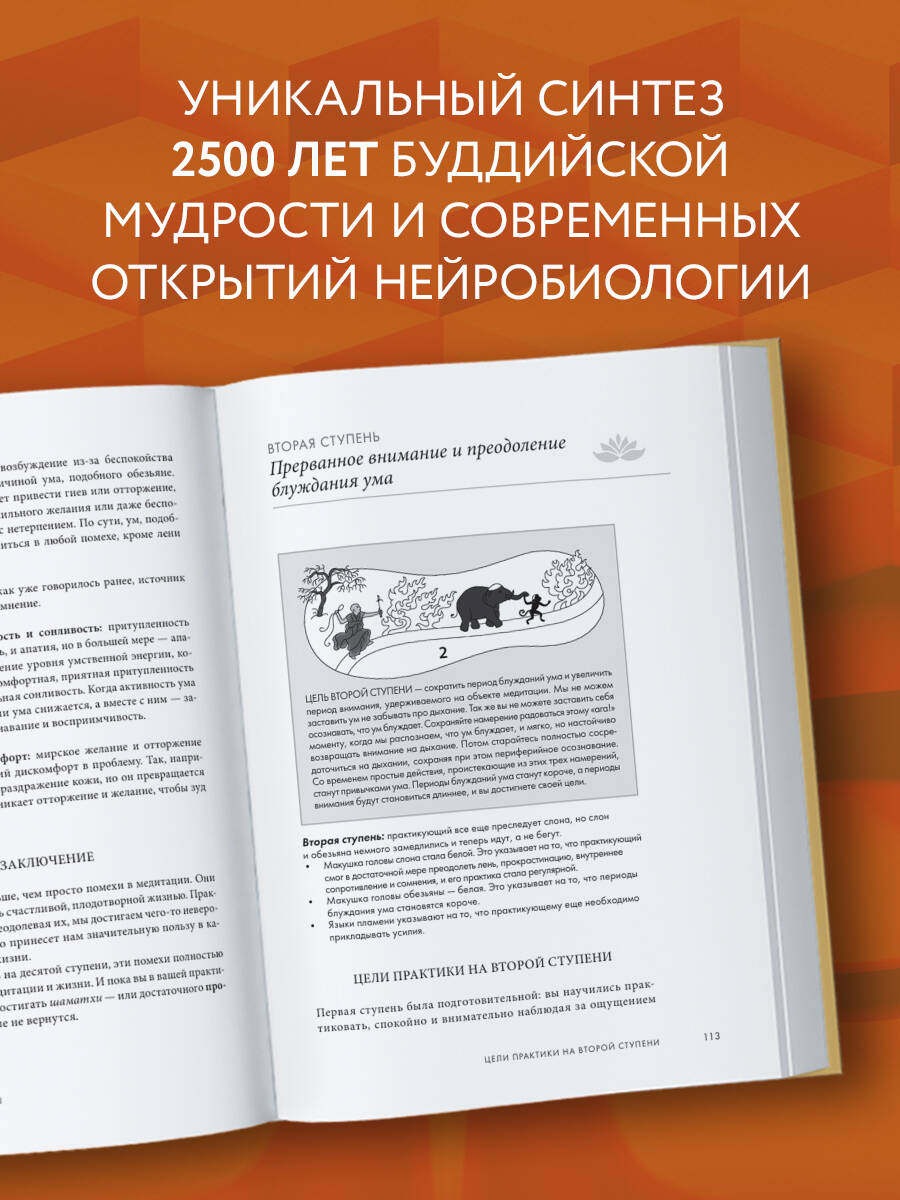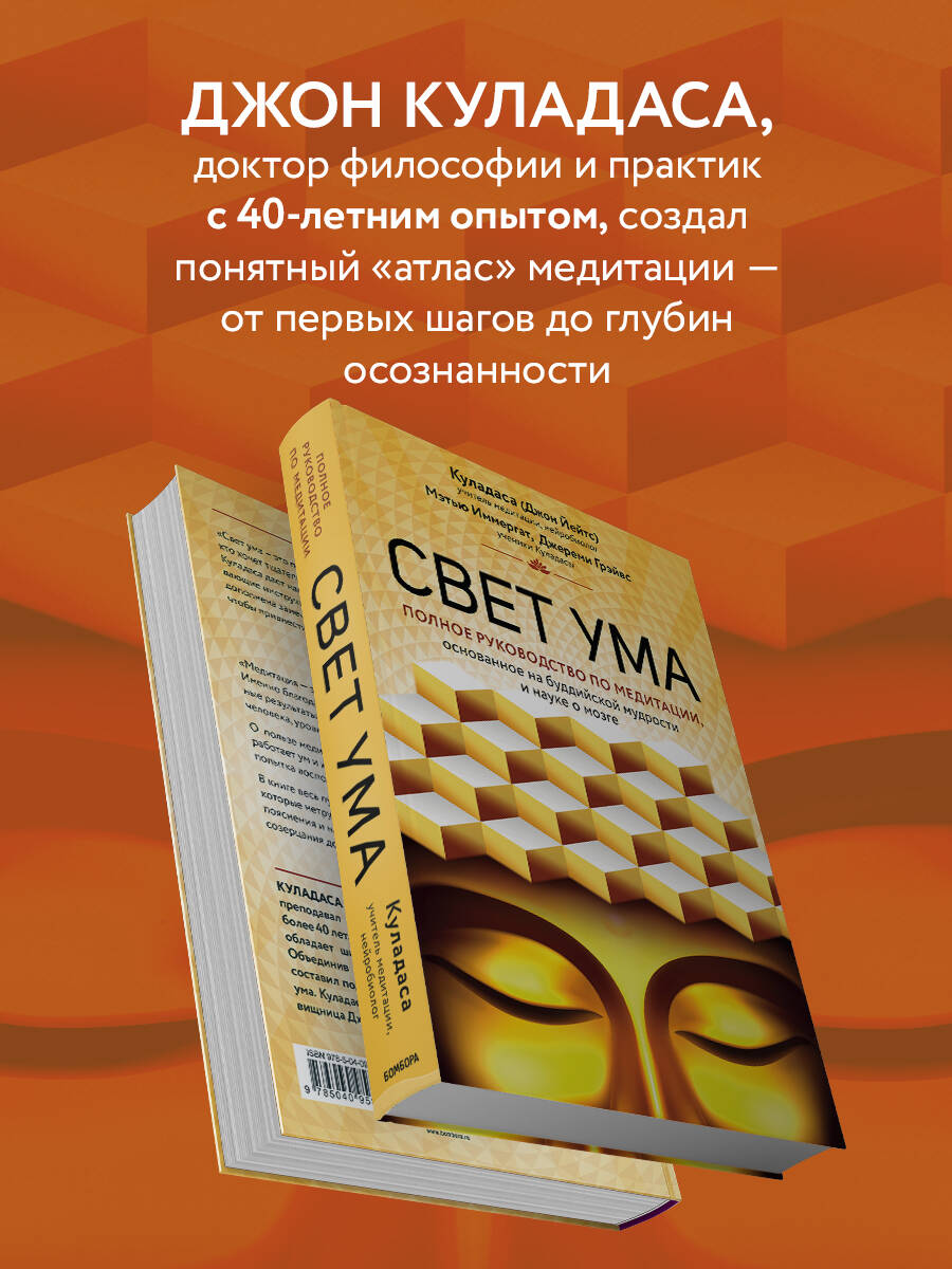 «Медитация - это наука, систематический процесс тренировки ума. Именно благодаря своей научности медитация дает одинаково полезные результаты всем, кто ее практикует, независимо от происхождения человека, уровня его знаний и подготовки». Куладаса Книга представляет собой подробнейшее современное исследование о том, как устроен наш ум. Автор - доктор философии и нейробиолог - практикует буддийскую медитацию более 40 лет, обладает широким и всесторонним знанием буддийского учения, которое он объединил с современным научным взглядом на ум. Цель книги - предоставить читателю понятную, подробную «дорожную карту» медитации и провести его от первых шагов на пути созерцания до самого порога пробуждения. В этой книге вы найдете: - подробное и научно обоснованное описание того, как в действительности работает наш ум, - прекрасно структурированную «дорожную карту»: описание 10 стадий прогресса практикующего с тщательными практическими инструкциями, - ясное, доступное и доброжелательное изложение материала, доступное всем. Отзывы читателей Amazon.com: Harvester:«Путеводитель по медитации, который меняет жизнь» «Эта книга - настоящая сокровищница знаний, она буквально изменила мою жизнь. Я редко перечитываю книги, но к этой возвращаюсь снова и снова - при том, что я даже не буддист. Можно сказать, что я ищу некую абсолютную и универсальную истину. Куладаса и его соавторы подробно и тщательно знакомят читателя с работой сознания. В университете на занятиях по нейробиологии я не раз слышал: хотя мы можем точно сказать, какие зоны мозга ответственны за эмоции, память, гнев, счастье и т.д., невозможно сказать, где же находится сознание. Эта книга помогает понять, что же такое «сознание» на самом деле и дает лучшее его описание из всех, мне знакомых. Почему простое сосредоточение на дыхании способно привести к таким глубоким изменениям? Почему этот процесс полностью меняет всю нашу систему убеждений? И почему, благодаря ему, вы наконец получаете ответы на сущностные вопросы, которыми задавались столько, сколько себя помните? Когда я начал практиковать медитацию, используя описанные в этой книге методы, у меня постоянно возникали все новые вопросы. И я был поражен тем, насколько подробно все разъяснено. Я прошел через довольно травматичный опыт, тот, что называется в книге «темной ночью души». Благодаря тренировке, приведенной в этой книге, я обрел внутренний мир, ясность и сосредоточение, каких не знал раньше. И уверен, что это лишь начало чего-то гораздо более глубокого. Книга лежит на моем столике для медитации. Я обращаюсь к ней каждый день. Информация в книге прекрасно структурирована - там есть заметки на полях, диаграммы и специально выделенные ключевые моменты. Если вы ищете научный труд по внимательности, путеводитель, который изменит вашу жизнь и поможет в поисках истины, то я искренне рекомендую вам эту книгу». P. Steele «Событие в науке. Шедевр». «Я рекомендую эту книгу даже тем, кто не собирается медитировать. Это лучшее описание того, как действительно работает наш ум - удивительно подробное и научно обоснованное. Автор книги, Куладаса, - преподавал нейробиологию и владеет научной картиной мира, но, кроме того, он вот уже более сорока лет практикует медитацию и изучает буддийские труды. В этой книге он открыл скрытую за пространными и практически н
