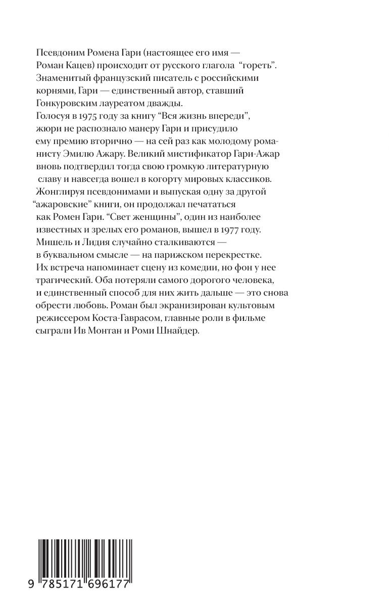 Французский классик с российскими корнями, военный летчик и блестящий дипломат, Ромен Гари (настоящее имя - Роман Кацев) - единственный писатель, получивший Гонкуровскую премию дважды: первый раз в 1956 году как Гари, второй - в 1975-м как Эмиль Ажар. Вторую награду Гари принять отказался и тайну никогда не существовавшего "Ажара" хранил, пока был жив. Он раскрыл эту мистификацию лишь в день своего самоубийства в 1980 году, отправив издателю текст под названием "Жизнь и смерть Эмиля Ажара". Выпуская одну за другой "ажаровские" книги, он продолжал печататься как Ромен Гари. "Свет женщины" (1977) - один из самых известных и самых пронзительных его романов о столкновении любви со смертью. Роман лег в основу фильма знаменитого Коста-Гавраса, главные роли сыграли Ив Монтан и Роми Шнайдер.