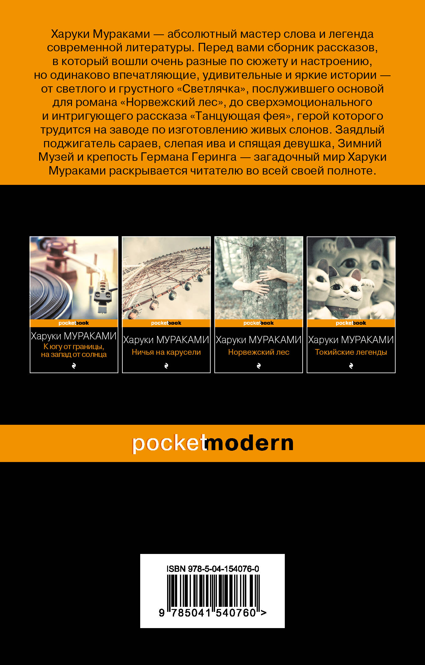 Харуки Мураками - абсолютный мастер слова и легенда современной литературы. Его мировая известность даже выше, чем та невероятная популярность, которую он снискал на родине в Японии. Его романы отмечены литературными премиями по всему миру. Каждая книга, вышедшая на русском, стала бестселлером. «Так я и пишу: сначала роман, за ним рассказы, опять роман и вновь рассказы. Не знаю почему - видимо, мне просто нравится сочинять». - Харуки Мураками Удивительные и яркие истории - светлый и грустный рассказ «Светлячок», эмоциональный и интригующий - «Танцующая фея». Заядлый поджигатель сараев, слепая ива и спящая девушка, Зимний Музей, висящий сад герра W и крепость Германа Герринга - загадочный мир Харуки Мураками раскрывается читателю во всей своей полноте. По рассказу «Сжечь сарай» южнокорейский режиссер Ли Чхан-дон снял фильм «Пылающий», ставший главным открытием Каннского фестиваля 2018 года.| Издательство | ООО "Издательство "Эксмо" |