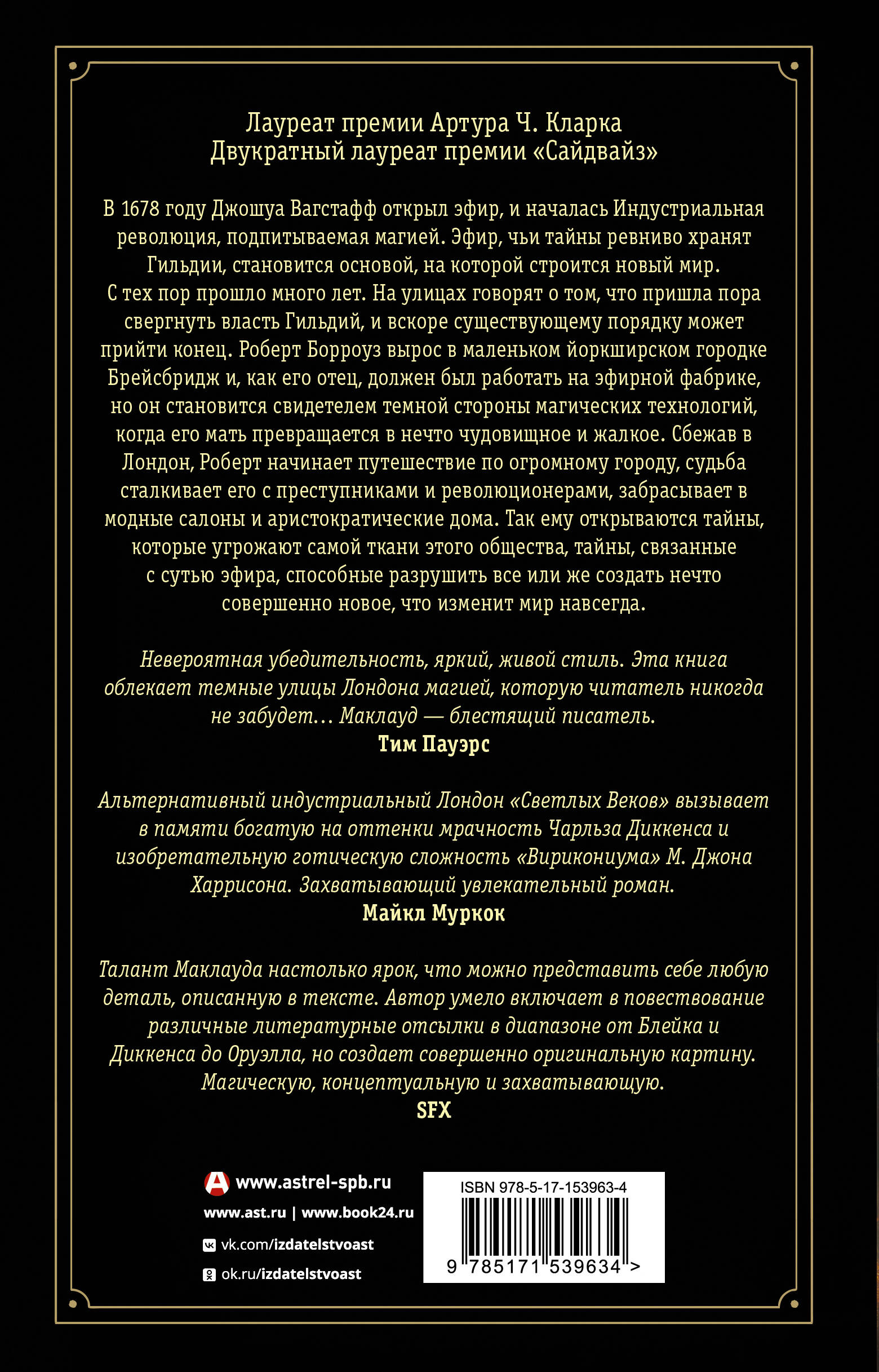 «Светлые века» - первая книга цикла «Вселенная эфира», фантазия в духе одновременно Чарльза Диккенса и Чайны Мьевиля, яркая смесь фэнтези, альтернативной истории и классического викторианского романа, вызывающая ассоциации с такими произведениями, как «Вокзал потерянных снов», «Горменгаст» и «Джонатан Стрейндж и мистер Норрелл». Йен Р. Маклауд - двукратный лауреат Всемирной премии фэнтези, лауреат премии «Локус», лауреат премии Артура Ч. Кларка, двукратный лауреат премии «Сайдвайз». В переводе Наталии Осояну.| Издательство | Издательство "АСТ" |