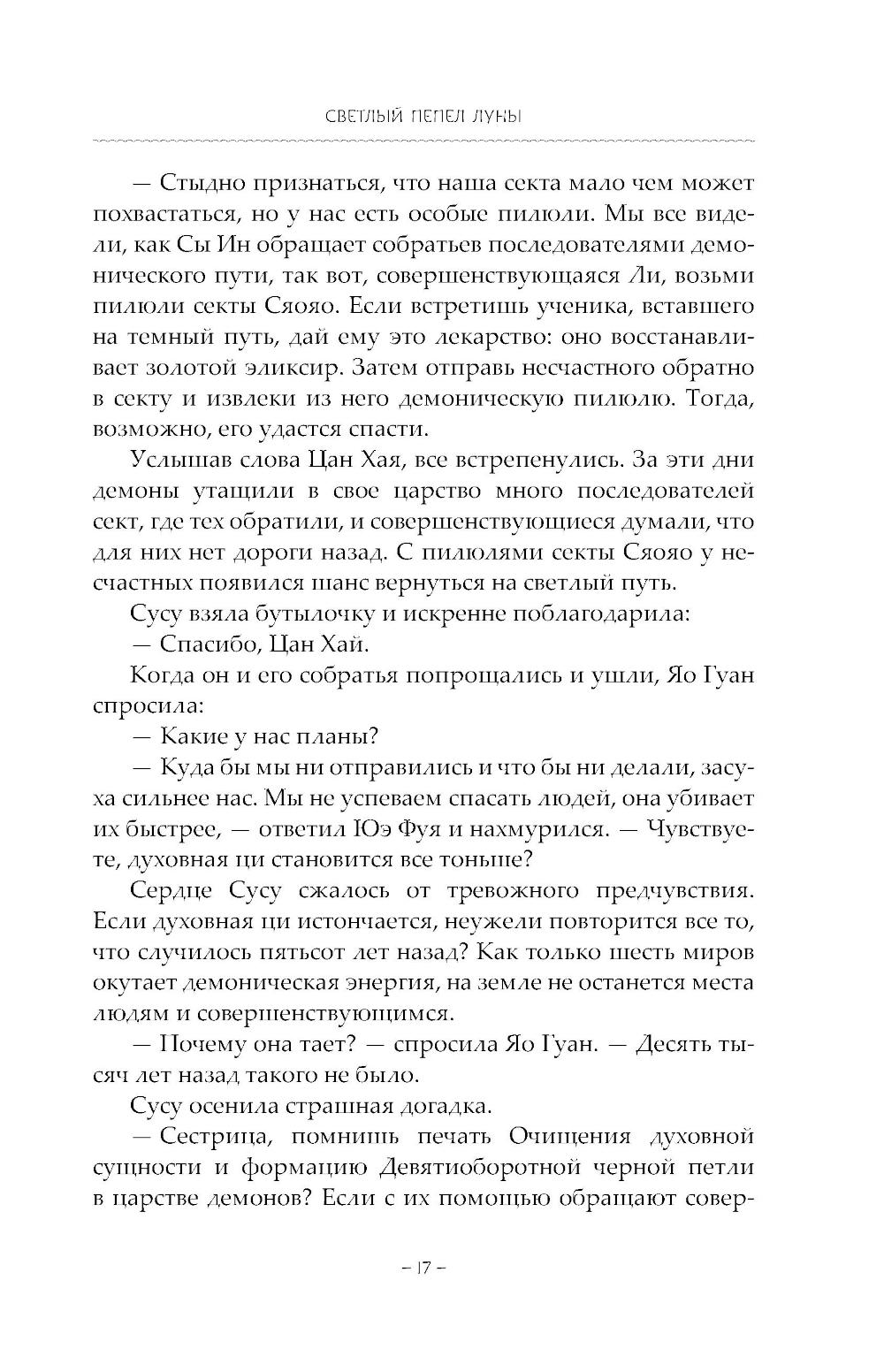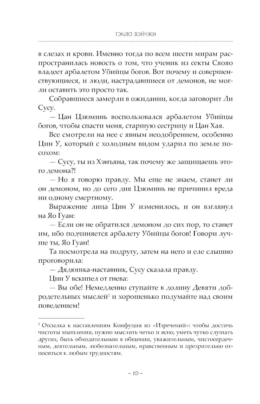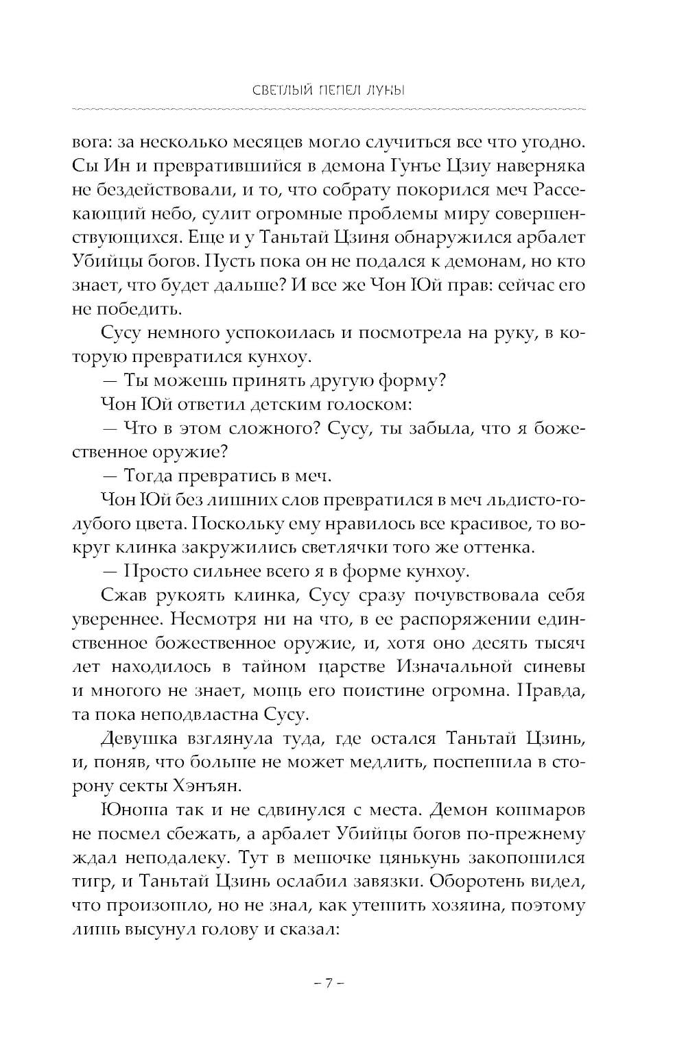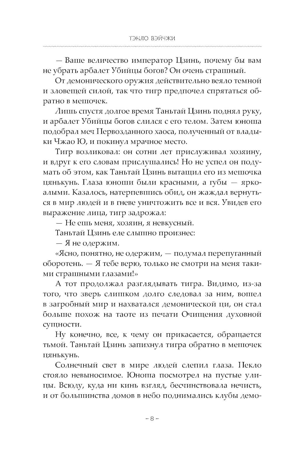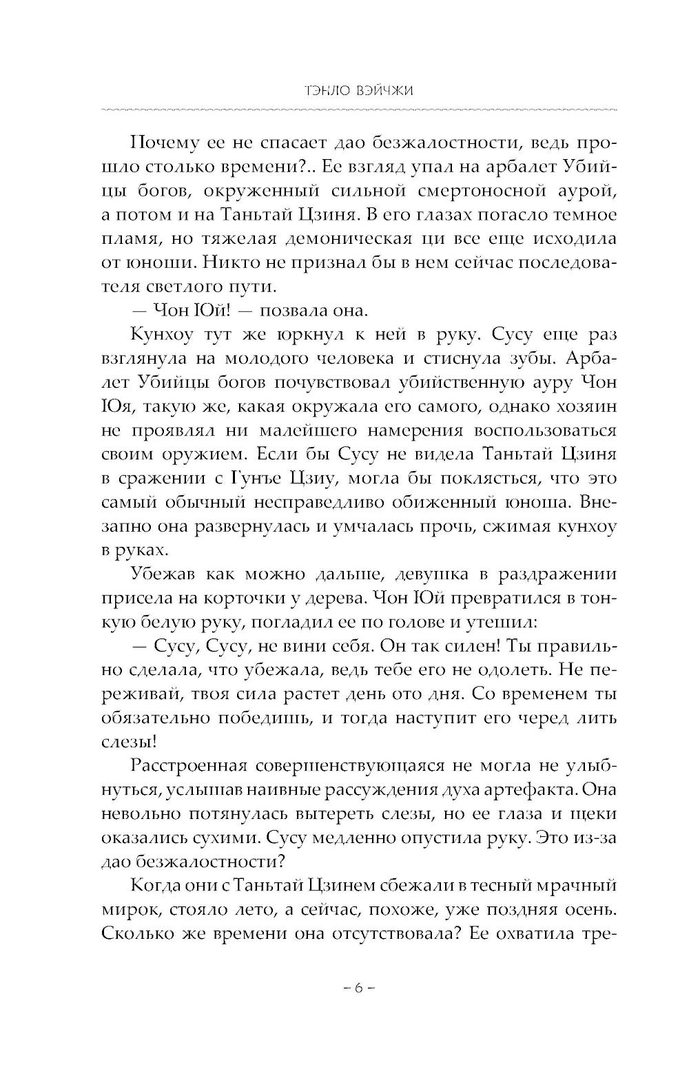 Грядет война: демон засухи хочет открыть Путь всеобщей скорби и обратить обитателей шести миров в демонов. Ей не хватает только повелителя, который их возглавит. Но Ли Сусу уже изменила ход истории и верит, что ее жертва помогла Таньтай Цзиню избавиться от тьмы и научила его сердце любить. Однако прошлое словно повторяется: он вновь управляет арбалетом Убийцы богов, а в его глазах вспыхивает кроваво-красный блеск. Удастся ли Сусу в последний раз удержать Таньтай Цзиня от падения во мрак или тьма поглотит его окончательно?| Издательство | АСТ |