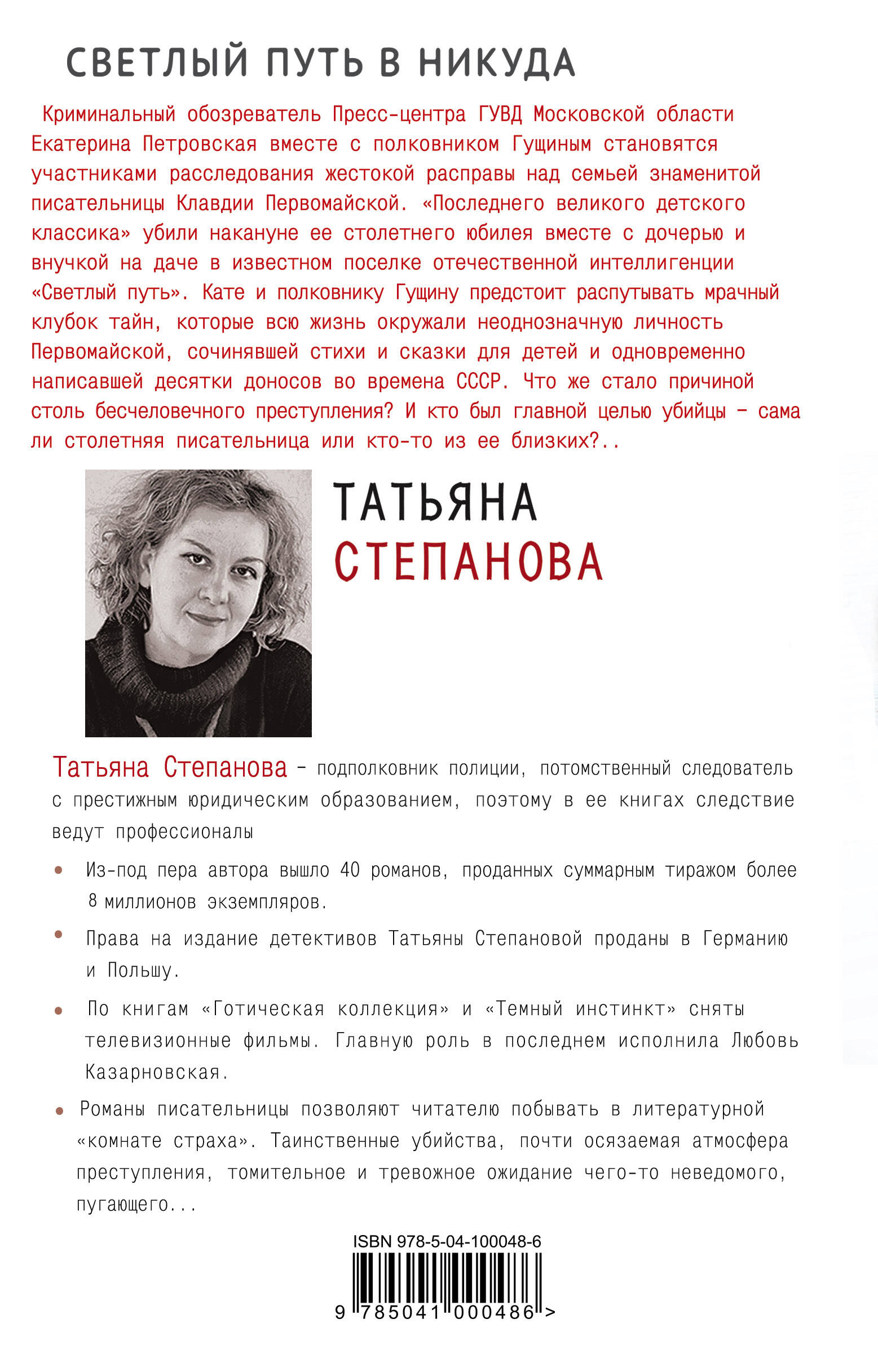 Криминальный обозреватель Пресс-центра ГУВД Московской области Екатерина Петровская вместе с полковником Гущиным становятся участниками расследования жестокой расправы над семьей знаменитой писательницы Клавдии Первомайской. "Последнего великого детского классика" убили накануне ее столетнего юбилея вместе с дочерью и внучкой на даче в известном поселке отечественной интеллигенции "Светлый путь". Кате и полковнику Гущину предстоит распутывать мрачный клубок тайн, которые всю жизнь окружали неоднозначную личность Первомайской, сочинявшей стихи и сказки для детей и одновременно написавшей десятки доносов во времена СССР. Что же стало причиной столь бесчеловечного преступления? И кто был главной целью убийцы - сама ли столетняя писательница или кто-то из ее близких?..| Издательство | ООО "Издательство "Эксмо" |