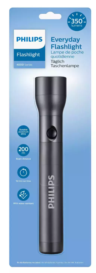 Philips SFL4003T/10. Тип лампы: погружной светильник, цвет продукта: черный. Код международной защиты (IP): IPX4. Тип лампы: LED. Тип батареи: AA, технология батареи:щелочная батарея. Ширина упаковки: 120 мм, глубина упаковки: 50 мм, высота упаковки: 380 мм