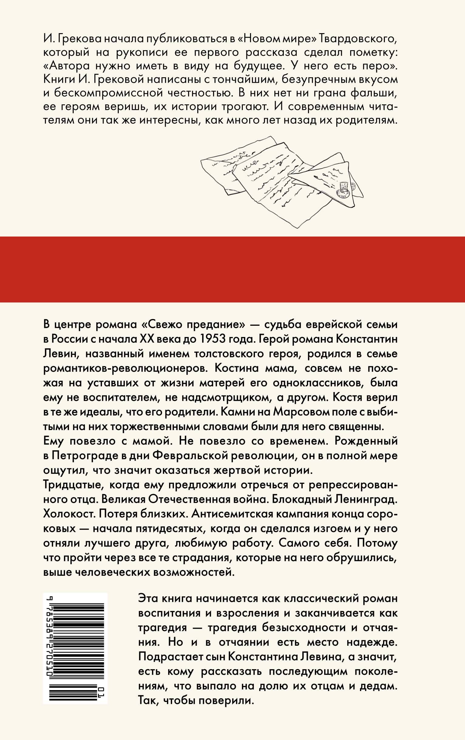 В центре романа "Свежо предание" - судьба еврейской семьи в России с начала ХХ века до 1953 года. Герой романа Константин Левин, названный именем толстовского героя, родился в семье романтиков-революционеров. Его мама, совсем не похожая на уставших от жизни матерей одноклассников, была ему не воспитателем, не надсмотрщиком, а другом. Костя верил в те же идеалы, что его родители. Камни на Марсовом поле с выбитыми на них торжественными словами, были для него священны. Ему повезло с мамой. Не повезло со временем. Рожденный в Петрограде в дни Февральской революции, он в полной мере ощутил, что значит оказаться жертвой истории. Тридцатые, когда ему предложили отречься от репрессированного отца. Великая Отечественная война. Блокадный Ленинград. Холокост. Потеря близких. Антисемитская кампания конца сороковых - начала пятидесятых, когда он сделался изгоем и у него отняли лучшего друга, любимую работу. Самого себя. Потому что пройти через все те страдания, которые на него обрушились, выше человеческих возможностей. Эта книга начинается как классический роман воспитания и взросления и заканчивается как трагедия - трагедия безысходности и отчаяния. Но и в отчаянии есть место надежде. Подрастает сын Константина Левина, а значит, есть кому рассказать последующим поколениям, что выпало на долю их отцам и дедам. Так, чтобы поверили.| Издательство | Азбука-Аттикус Издат.группа ООО |