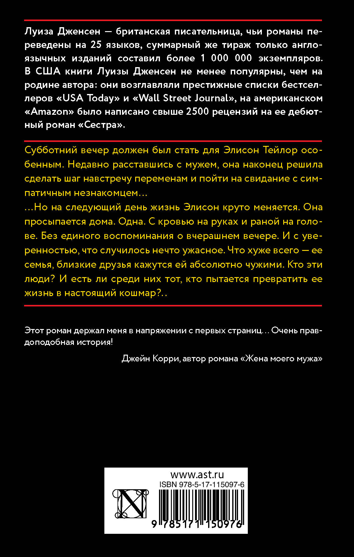 Субботний вечер должен был стать для Элисон Тейлор особенным. Недавно расставшись с мужем, она наконец решила сделать шаг навстречу переменам и пойти на свидание с симпатичным незнакомцем… …Но на следующий день жизнь Элисон круто меняется. Она просыпается дома. Одна. С кровью на руках и раной на голове. Без единого воспоминания о вчерашнем вечере. И с уверенностью, что случилось нечто ужасное. Что хуже всего - ее семья, близкие друзья кажутся ей абсолютно чужими. Кто эти люди? И есть ли среди них тот, кто пытается превратить ее жизнь в настоящий кошмар?..| Издательство | ИЗДАТЕЛЬСТВО "АСТ" |
