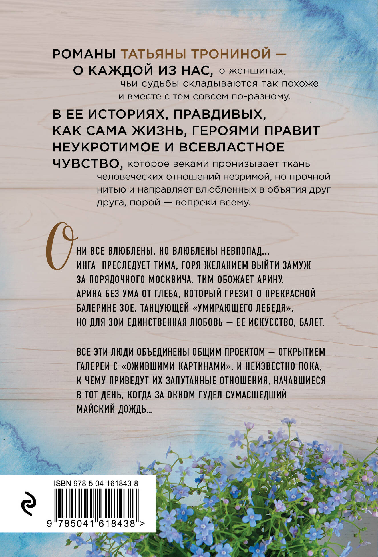 Они все влюблены, но влюблены невпопад... Инга преследует Тима, горя желанием выйти замуж за порядочного москвича. Тим обожает Арину. Арина без ума от Глеба, который грезит о прекрасной балерине Зое, танцующей «Умирающего лебедя». Но для Зои единственная любовь - ее искусство, балет. Все эти люди объединены общим проектом - открытием галереи с «ожившими картинами». И неизвестно пока, к чему приведут их запутанные отношения, начавшиеся в тот день, когда за окном гудел сумасшедший майский дождь… Простые, душевные и теплые романы Татьяны Трониной рассказывают о самом светлом человеческом чувстве - о любви. Герои оказываются в сложных жизненных обстоятельствах, им часто приходится делать выбор между долгом и мечтой, стабильностью и свободой, между собственным благом и комфортом других. Но, несмотря на сложные испытания, они заслуживают счастья.