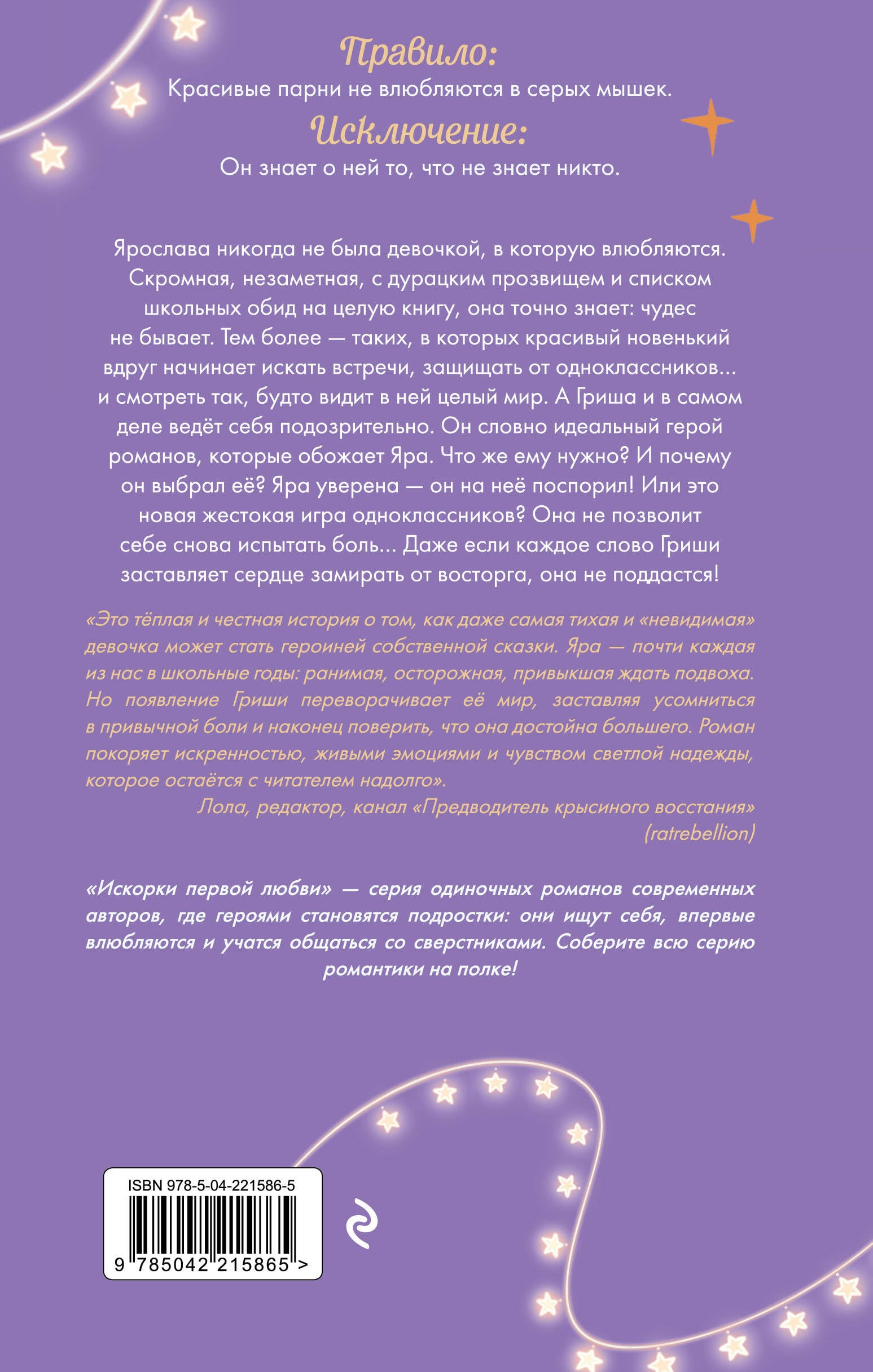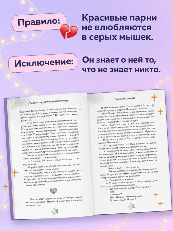Правило: Красивые парни не влюбляются в серых мышек. Исключение: Он знает о ней то, что не знает никто. Новинка в серии одиночных романтических историй российских авторов «Искорки первой любви»! Вас ждет невероятная история о чувствах, прошедших сквозь время. Роман напомнит вам фильм «С любовью, Рози», а также роман Аси Лавринович «Все из-за тебя». Ярослава никогда не была девочкой, в которую влюбляются. Скромная, незаметная, с дурацким прозвищем и списком обид на целую книгу, она точно знает: чудес не бывает. Тем более - таких, в которых красивый новенький вдруг начинает искать встречи, защищать от одноклассников… и смотреть так, будто видит в ней целый мир. А Гриша и в самом деле ведет себя подозрительно. Он словно идеальный герой романов, которые обожает Яра. Что же ему нужно? И почему он выбрал ее? Яра уверена - он на нее поспорил! Или новая жестокая игра одноклассников? Она не позволит себе снова испытать боль… Даже если каждое слово Гриши заставляет сердце замирать от восторга, она не поддастся! Невероятной красоты серия историй любви, которая украсит вашу полку. В оформлении использована фольга и сверкающий лак с вкраплениями ярких блесток! Собери всю коллекцию романтики! Книги серии можно узнать по розовым сердечкам на корешке: - «Только попробуй влюбиться» Аксинья Карпова; - «Выбирай сердцем» Лия Болотова; - «Недотрога и хулиган» Ирина Молчанова; - «Лето моей любви» Наталья Миловицкая, Ольга Коробкова; - «Репетиция поцелуя» Анна Антонова; - «Свидание под небом из тысячи звёзд» Ирина Молчанова. Прочтите роман «Свидание под небом из тысячи звёзд», если вам понравились «Шипы первой любви. Прогульщик» Эмилии Грин, «Пепел» Ники Сью, «#ЛюбовьНенависть» Анны Джейн, «Это всегда был он» Алекс Хилл, «Там, где живет любовь» и «Все из-за тебя» Аси Лавринович, «Артур, Луи и Адель» Даны Делон.| Издательство | ООО "Издательство "Эксмо" |