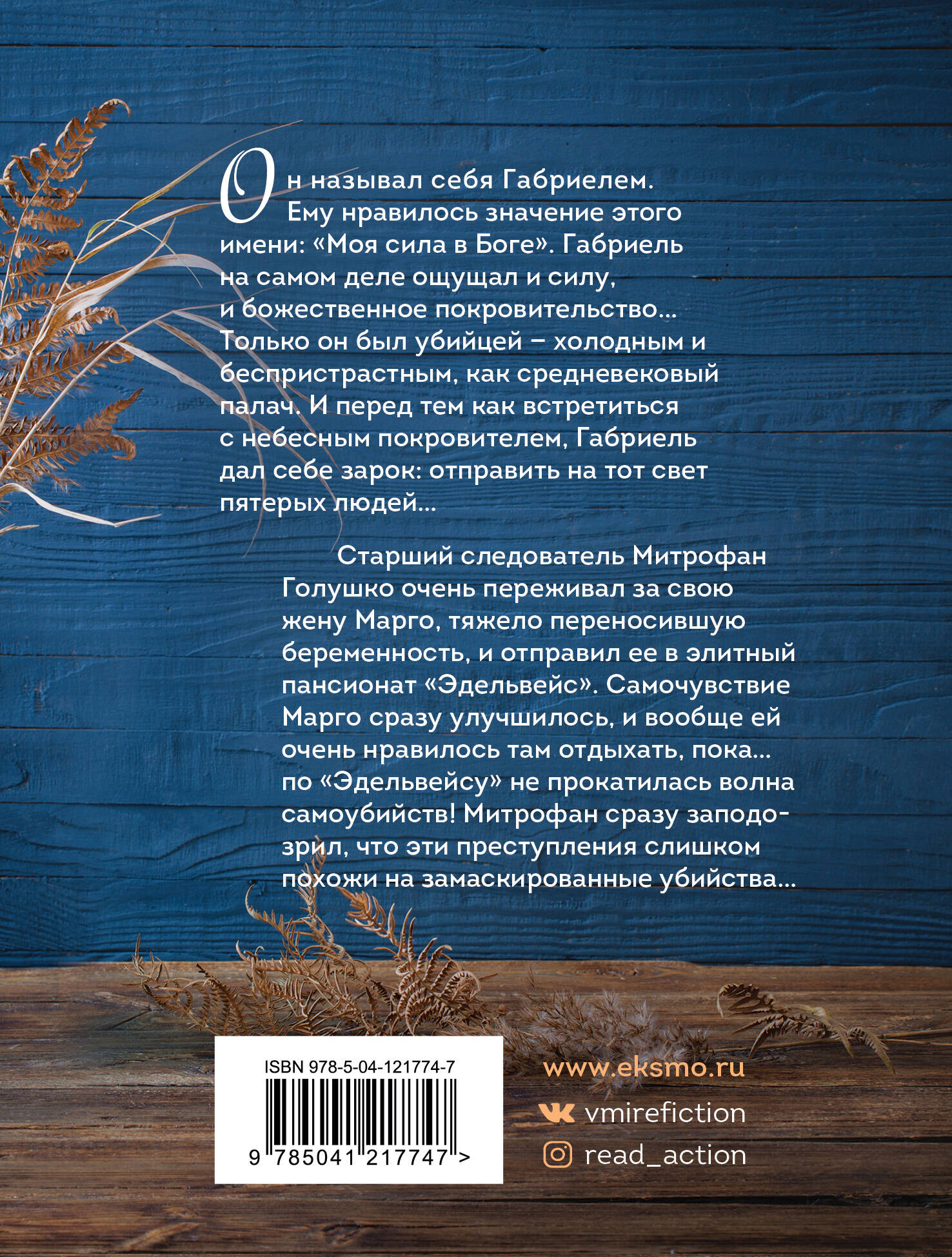 Он называл себя Габриелем. Ему нравилось значение этого имени: "Моя сила в Боге". Габриель на самом деле ощущал и силу, и божественное покровительство… Только он был убийцей - холодным и беспристрастным, как средневековый палач. И перед тем, как встретиться с небесным покровителем, Габриель дал себе зарок: отправить на тот свет пятерых людей… Старший следователь Митрофан Голушко очень переживал за свою жену Марго, тяжело переносившую беременность, и отправил ее в элитный пансионат "Эдельвейс". Самочувствие Марго сразу улучшилось, и вообще ей очень нравилось там отдыхать, пока… по "Эдельвейсу" не прокатилась волна самоубийств! Митрофан сразу заподозрил, что эти преступления слишком похожи на замаскированные убийства…| Издательство | ООО "Издательство "Эксмо" |