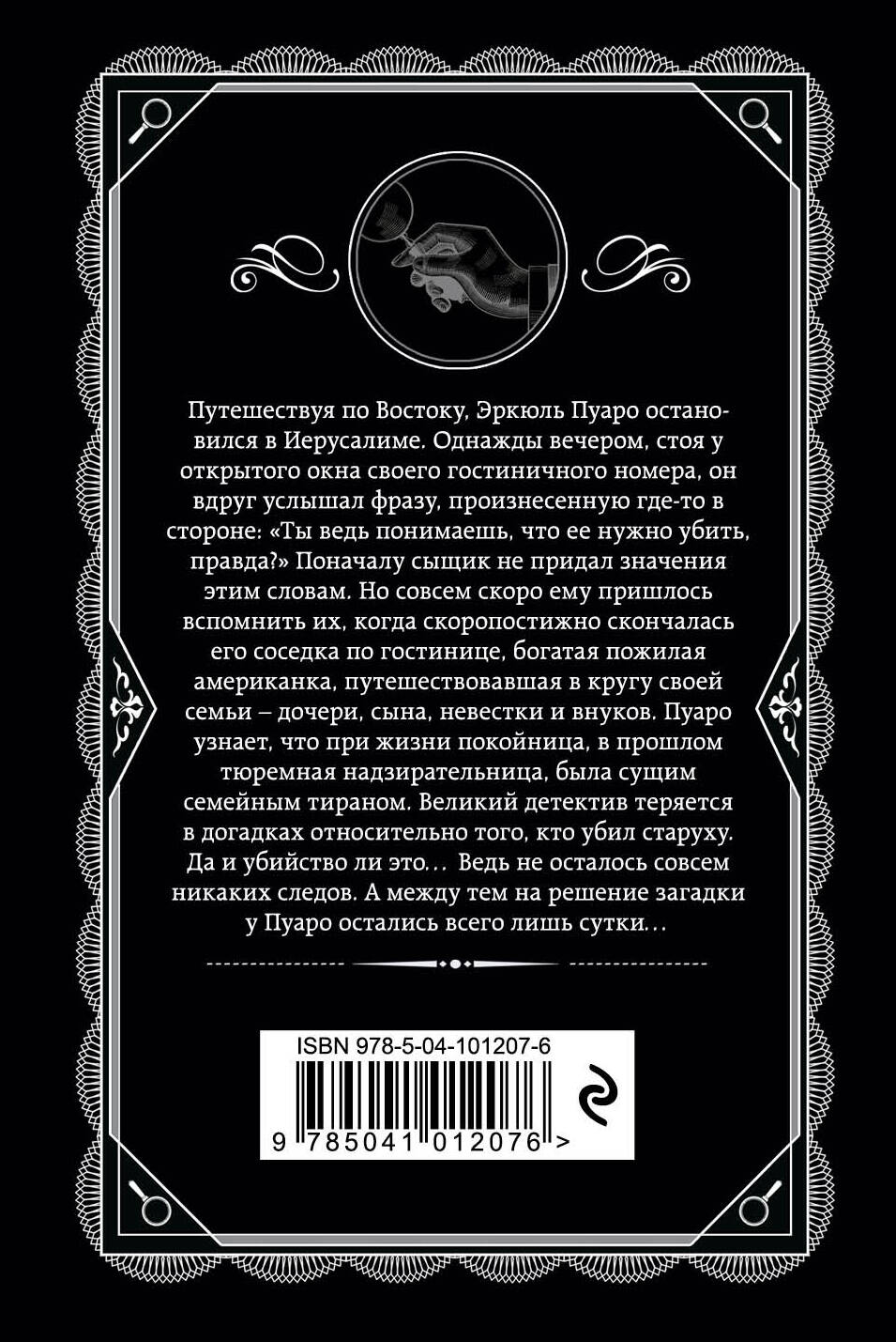 Путешествуя по Востоку, Эркюль Пуаро остановился в Иерусалиме. Однажды вечером, стоя у открытого окна своего гостиничного номера, он вдруг услышал фразу, произнесенную где-то в стороне: «Ты ведь понимаешь, что ее нужно убить, правда?». Поначалу сыщик не придал значения этим словам. Но совсем скоро ему пришлось вспомнить их, когда скоропостижно скончалась его соседка по гостинице, богатая пожилая американка, путешествовавшая в кругу своей семьи - дочери, сына, невестки и внуков. Пуаро узнает, что при жизни покойница, в прошлом тюремная надзирательница, была сущим семейным тираном. Великий детектив теряется в догадках относительно того, кто убил старуху. Да и убийство ли это… Ведь не осталось совсем никаких следов. А между тем на решение загадки у Пуаро остались всего лишь сутки…| Издательство | ООО "Издательство "Эксмо" |