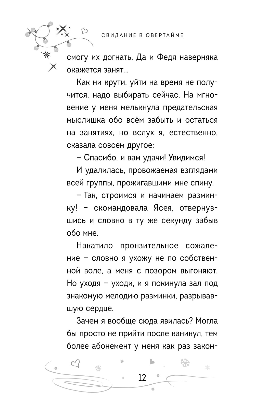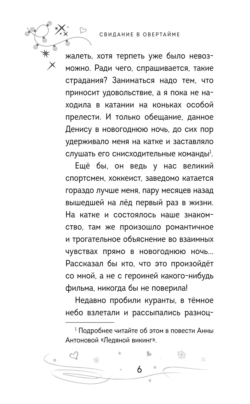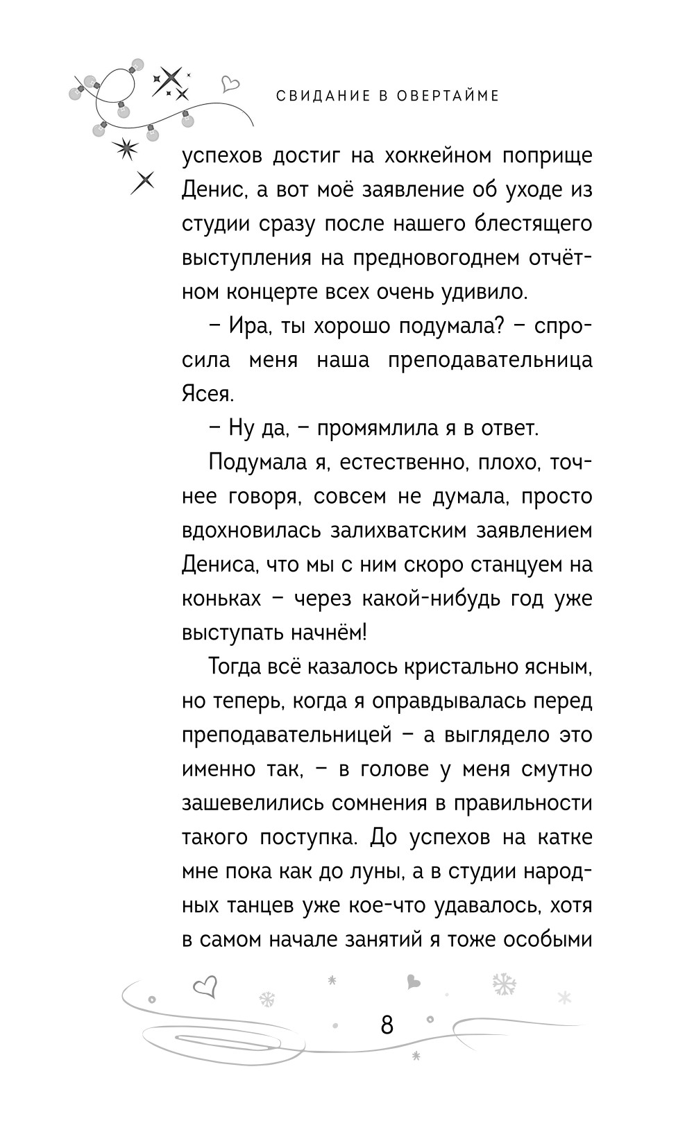 Книга для девочек-подростков о первой любви, поиске себя и спорте! Ира жалела, что бросила народные танцы. Как у нее здорово получалось с партнером Федей! Но ушла она из-за совсем другого парня - Дениса, с которым познакомилась на катке... Это он посеял в её душе сомнения, предложив заниматься фигурным катанием. И тренироваться в паре с ним, разумеется! Девушка ничего не имела против, наоборот, с радостью окунулась в новое увлечение. Но она даже не представляла, как тяжело ей придется! А Денис - тот, ради кого она сменила танцевальные туфли на остро заточенные коньки, - сам, оказывается, по-прежнему занимается хоккеем! Разве об этом они договаривались?! Ира всерьёз обиделась на парня. Сумеют ли молодые люди разобраться в своих чувствах, используя овертайм?| Издательство | Эксмо |