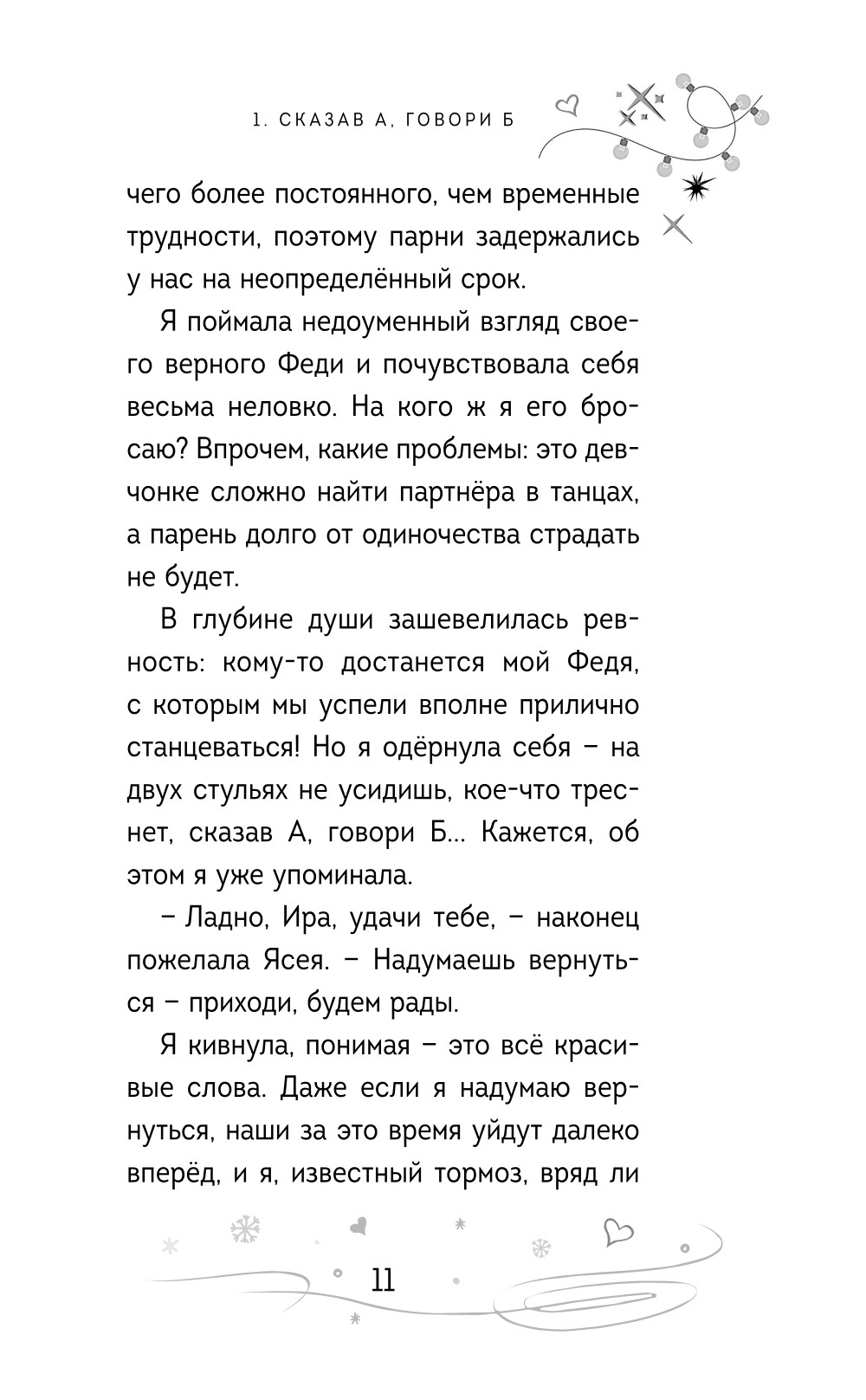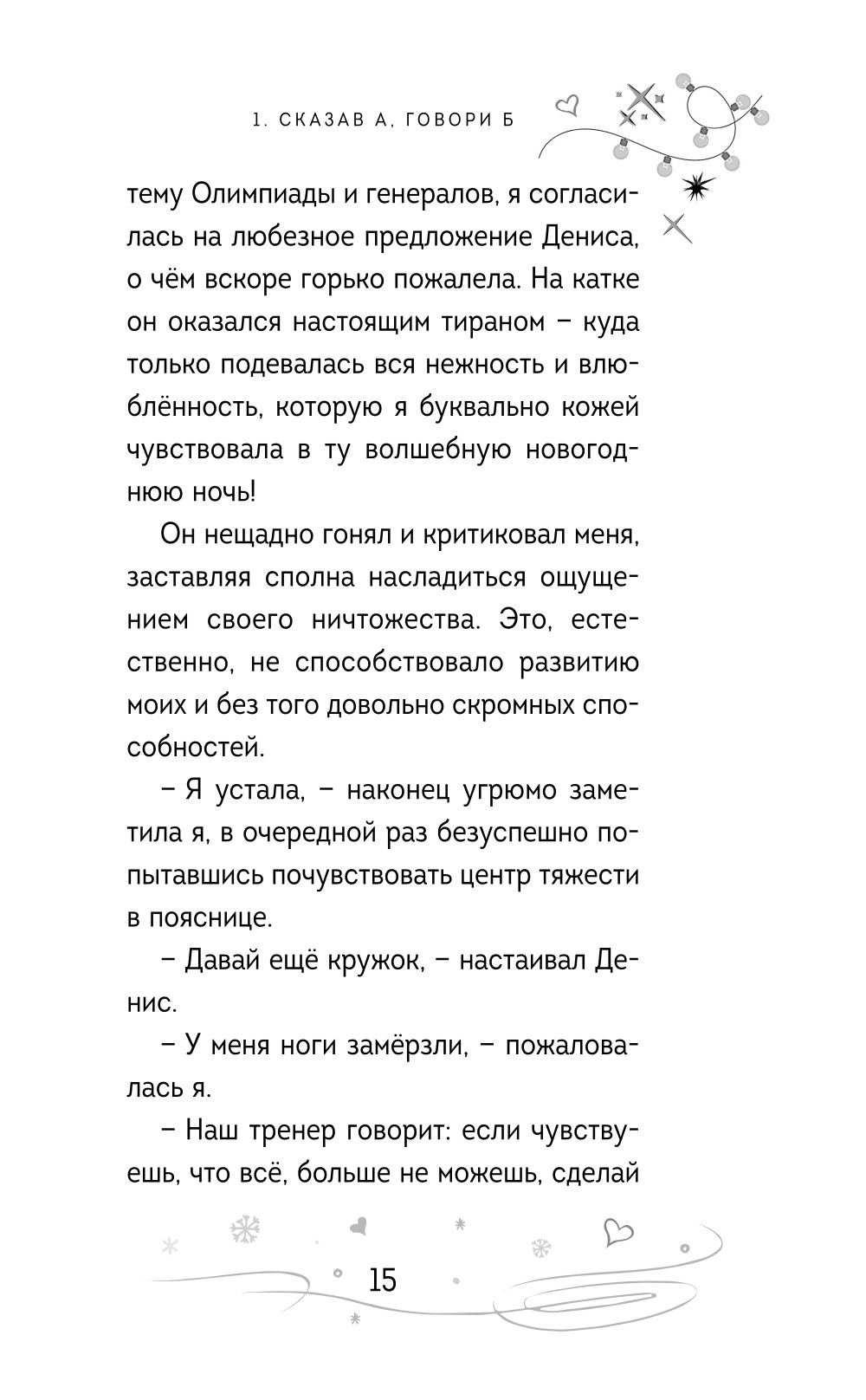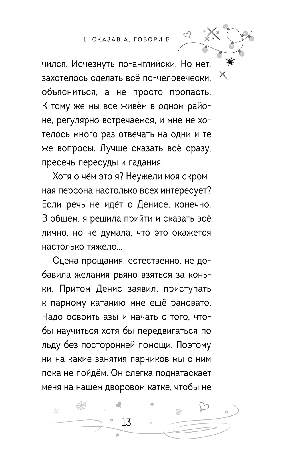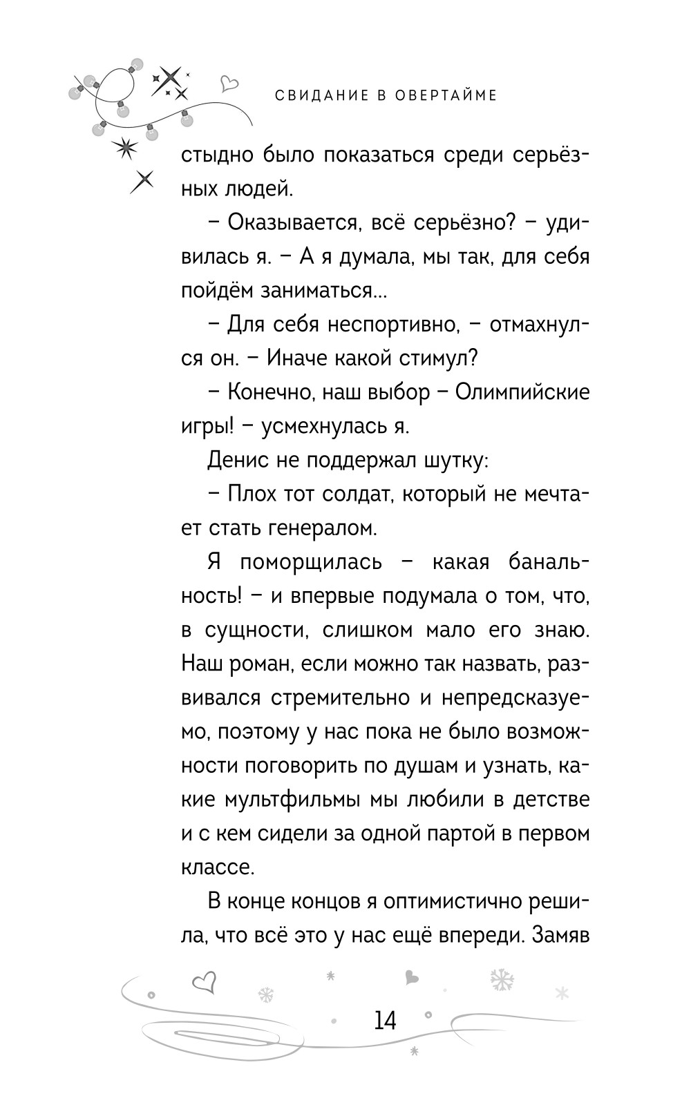 Книга для девочек-подростков о первой любви, поиске себя и спорте! Ира жалела, что бросила народные танцы. Как у нее здорово получалось с партнером Федей! Но ушла она из-за совсем другого парня - Дениса, с которым познакомилась на катке... Это он посеял в её душе сомнения, предложив заниматься фигурным катанием. И тренироваться в паре с ним, разумеется! Девушка ничего не имела против, наоборот, с радостью окунулась в новое увлечение. Но она даже не представляла, как тяжело ей придется! А Денис - тот, ради кого она сменила танцевальные туфли на остро заточенные коньки, - сам, оказывается, по-прежнему занимается хоккеем! Разве об этом они договаривались?! Ира всерьёз обиделась на парня. Сумеют ли молодые люди разобраться в своих чувствах, используя овертайм?| Издательство | Эксмо |
