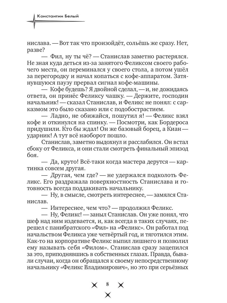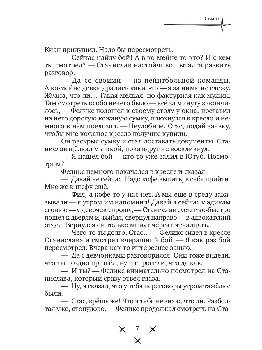 Москва, наше время. Главный герой романа Феликс - молодой преуспевающий юрист, привыкший всегда добиваться своих целей. Случайная встреча на вечере выпускников с одноклассниками приводит к тому, что он получает на работе задание по узаконенному отъёму спортивного клуба смешанных единоборств (в просторечии «бои без правил») «Свинг». Он погружается в новый для себя мир, который постепенно увлекает его, он тренируется, помогает бойцам готовиться и выступать на турнирах ММА. Он сближается с новыми друзьями - руководителем клуба и ведущими бойцами клуба, включая девушку-бойца Эрику. Основные события проходя на фоне ММА в различных декорациях - на тренировках, между ними, в спаррингах, на профессиональных турнирах, в криминальных «разборках».| Издательство | Т8 RUGRAM |