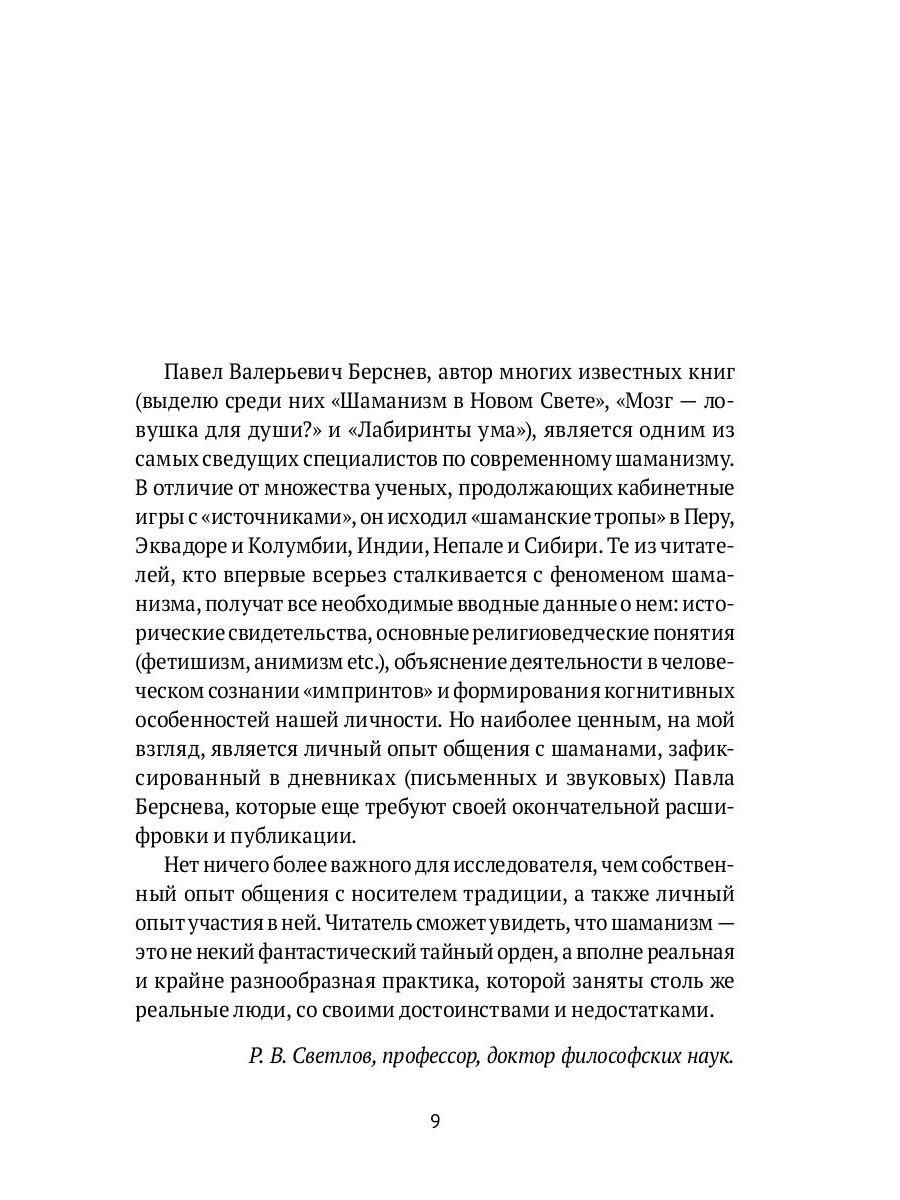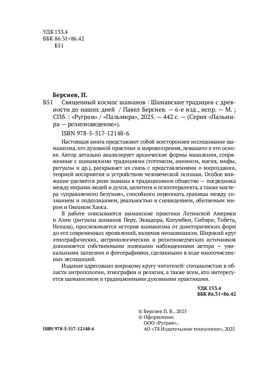 Настоящая книга представляет собой всестороннее исследование шаманизма, его духовной практики и мировоззрения, лежащего в его основе. Автор детально анализирует архаические формы мышления, сопряженные с шаманскими традициями (тотемизм, анимизм, магия, мифы, ритуалы и др.), раскрывает их связь с представлениями о мироздании, теорией восприятия и устройством человеческой психики. Особое внимание уделяется роли шамана в традиционном обществе - посредника между мирами людей и духов, целителя и психотерапевта, а также мастера «управляемого безумия», способного пересекать границы между сознанием и подсознанием, реальностью и сновидением, обитаемым миром и Океаном Хаоса. В работе описываются шаманские практики Латинской Америки и Азии (ритуалы шаманов Перу, Эквадора, Колумбии, Сибири, Тибета, Непала), прослеживается история шаманизма от доисторических форм до его современных проявлений, включая неошаманизм. Широкий круг этнографических, антропологических и религиоведческих источников дополняется собственными полевыми наблюдениями автора - уникальными записями и фотографиями, сделанными в ходе многочисленных экспедиций. Издание адресовано широкому кругу читателей: специалистам в области антропологии, этнографии и религии, а также всем, кто интересуется шаманизмом и традиционными духовными практиками.| Издательство | Т8 RUGRAM |