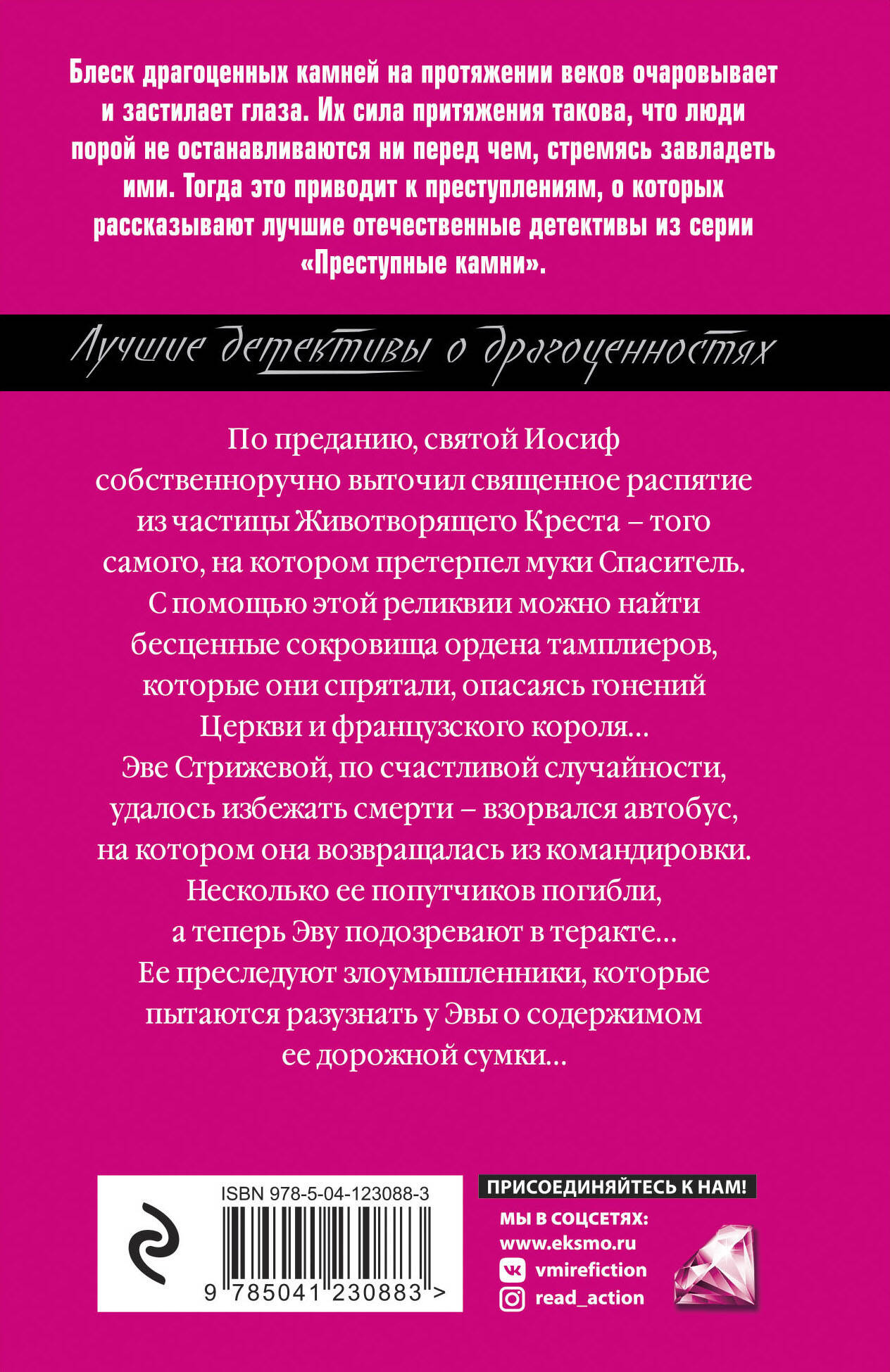 По преданию, святой Иосиф собственноручно выточил священное распятие из частицы Животворящего Креста - того самого, на котором претерпел муки Спаситель. С помощью этой реликвии можно найти бесценные сокровища ордена тамплиеров, которые они спрятали, опасаясь гонений Церкви и французского короля… Эве Стрижевой по счастливой случайности удалось избежать смерти - взорвался автобус, на котором она возвращалась из командировки. Несколько ее попутчиков погибли, а теперь Эву подозревают в теракте… Ее преследуют злоумышленники, которые пытаются разузнать у Эвы о содержимом ее дорожной сумки… Блеск драгоценных камней на протяжении веков очаровывает и застилает глаза. Их сила притяжения такова, что люди порой не останавливаются ни перед чем, стремясь завладеть ими. Тогда это приводит к преступлениям, о которых рассказывают лучшие отечественные детективы из серии «Преступные камни».| Издательство | ООО "Издательство "Эксмо" |