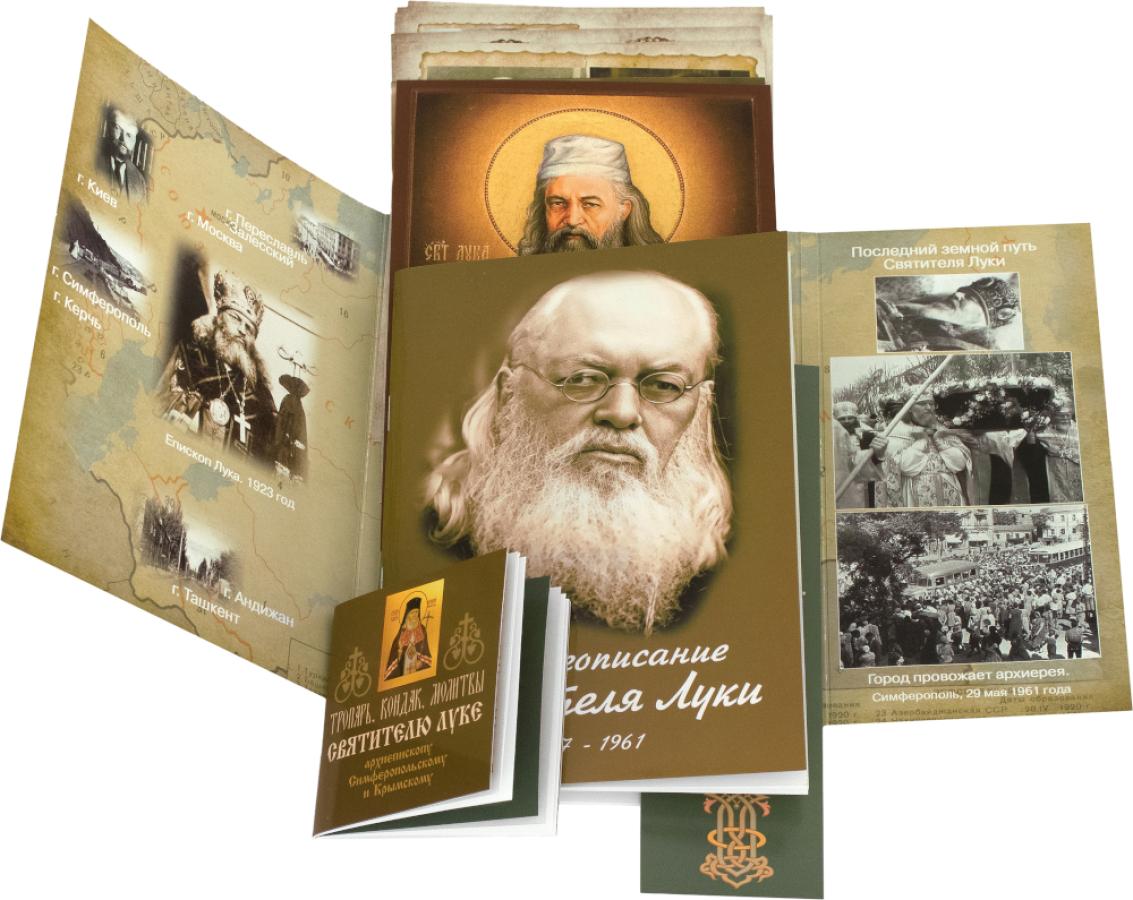 В подарочный комплект, посвященный святителю Луке, архиепископу Симферопольскому и Крымскому, вошли жизнеописание угодника Божия, брошюра с тропарем, кондаком и молитвой ему, икона святого, закладка с молитвой, а также 7 открыток с фотографиями, отражающими жизненный путь архипастыря.| Издательство | ИП Линд А. |