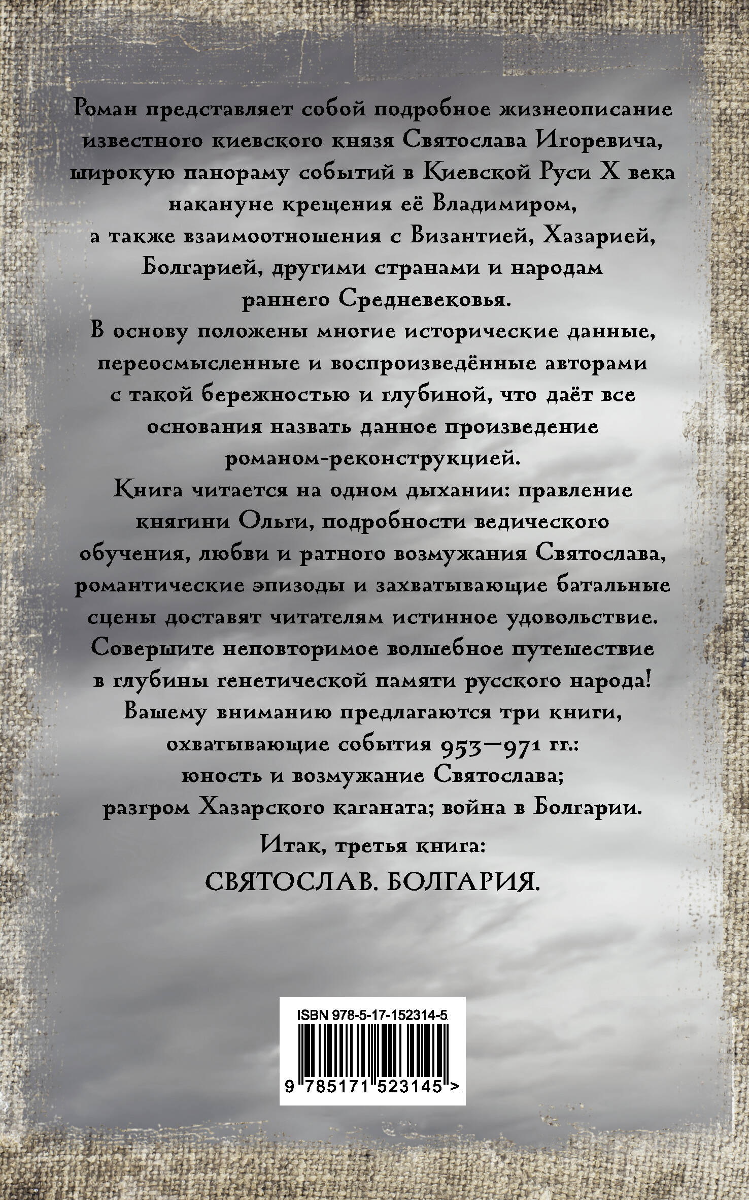 Валентин и Юлия Гнатюк, авторы ряда книг на древнеславянскую тематику, среди которых замечательная трилогия о его внуке князе Святославе Хоробром. Увлекательная правдивая история о князе Cвятославе читается на одном дыхании. В основу положены многие исторические данные, переосмысленные и воспроизведённые авторами с такой бережностью и глубиной, что даёт все основания назвать данное произведение романом-реконструкцией.Факты, описанные в книге, в школьной программе не упоминаются. Интересна для углубленного понимания истории славян. - Уникальные исторические факты про правление Святослава. - Факты, описанные в книге, в школьной программе не упоминаются. - Интересна для углубленного понимания истории славян. Роман "Святослав. Болгария" представляет собой подробное жизнеописание известного киевского князя Святослава Игоревича, широкую панораму событий в Киевской Руси X века накануне крещения её Владимиром, а также взаимоотношения с Византией, Хазарией, Болгарией, другими странами и народами раннего Cредневековья. В основу положены многие исторические данные, переосмысленные и воспроизведенные авторами с такой бережностью и глубиной, что дает все основания назвать данное произведение романом-реконструкцией. Книга читается на одном дыхании: правление княгини Ольги, подробности ведического обучения, любви и ратного возмужания Святослава, романтические эпизоды и захватывающие батальные сцены доставят читателям истинное удовольствие. Совершите неповторимое волшебное путешествие в глубины генетической памяти русского народа! Вашему вниманию предлагается три книги, охватывающие события 953-971 гг.: юность и возмужание Святослава; разгром Хазарского каганата; война в Болгарии. Итак, третья книга: Святослав. Болгария. Для тех, кто любит историю и эту эпоху. У книги "Святослав. Болгария" очень удобный компактный формат с мягким переплетом. Удобно читать и брать с собой из-за ее легкости.| Издательство | ИЗДАТЕЛЬСТВО "АСТ" |