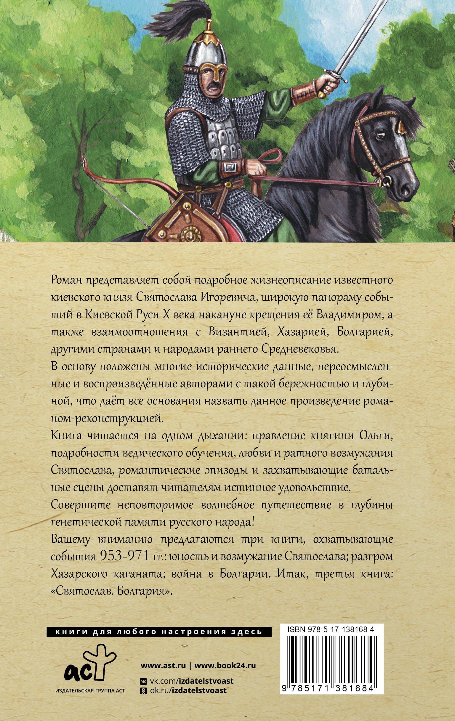 Валентин и Юлия Гнатюк, авторы ряда книг на древнеславянскую тематику, среди которых замечательная трилогия о его внуке князе Святославе Хоробром. Увлекательная правдивая история о князе Cвятославе читается на одном дыхании. В основу положены многие исторические данные, переосмысленные и воспроизведённые авторами с такой бережностью и глубиной, что даёт все основания назвать данное произведение романом-реконструкцией.Факты, описанные в книге, в школьной программе не упоминаются. Интересна для углубленного понимания истории славян.| Издательство | ИЗДАТЕЛЬСТВО "АСТ" |