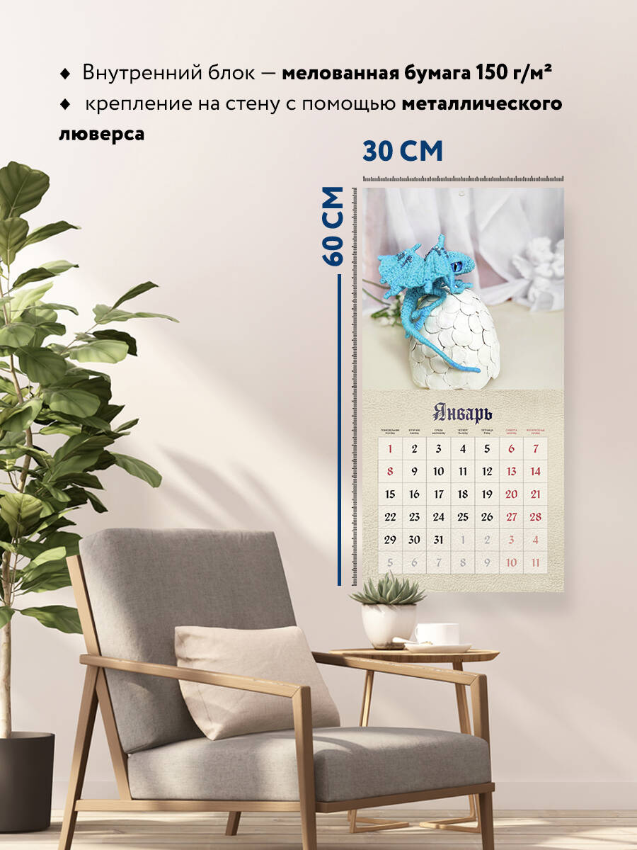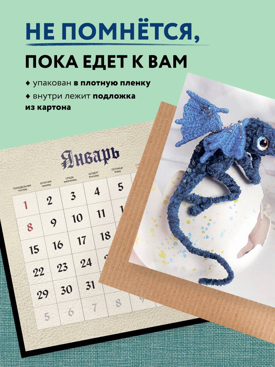 О серии: Наши настенные календари отличаются высоким качеством исполнения! Тщательно подобранные иллюстрации, напечатанные на глянцевой бумаге высочайшего качества, станут настоящим украшением дома, а в календарной сетке найдется место для ваших планов: большие клетки позволят делать записи и организовать свой год! В календаре также отмечены все государственные праздники. В серии настенных календарей издательства «ЭКСМО» каждый найдет тему по вкусу: великие художники, великолепные подборки с самыми знаменитыми произведениями искусства, легендарные кинематографические саги и игры, главные книжные авторы и бестселлеры, фотографии и иллюстрации любимых животных и многое-многое другое! О календаре: Как известно, 2024 год пройдет под покровительством Дракона. И, чтобы привлечь удачу на целый год, крайне необходимо обзавестись его символом. Вот только завести ручного дракона в современном мире проблематично. Тут-то и приходит на помощь этот календарь, на страницах которого вас ждут невероятные вязаные драконы в технике амигуруми от автора одноименной книги, блогера, Матери драконов Кристины Мавдрик @mavdrik_toys. Такой календарь не только разнообразит и украсит интерьер, но и обязательно принесет удачу на весь год! На обратной стороне календаря вас ждет QR-код со ссылкой на книгу, чтобы не только любоваться невероятными драконами, но и попробовать создать себе маленького ручного хранителя самостоятельно! Для кого: Этот календарь обязательно придется по вкусу всем любителям фэнтези и вязаных игрушек. Технические параметры: Тип календаря - настенный перекидной. Год - 2024. Календарная сетка - с разбивкой по месяцам. Вид скрепления - скрепка. Ширина - 30 см. Высота - 30 см. Внутренний блок - мелованная бумага 150 г/м2. Подложка - плотный гофрокартон для поддержания формы. Индивидуальная упаковка в плотный целлофановый пакет.| Издательство | ООО "Издательство "Эксмо" |