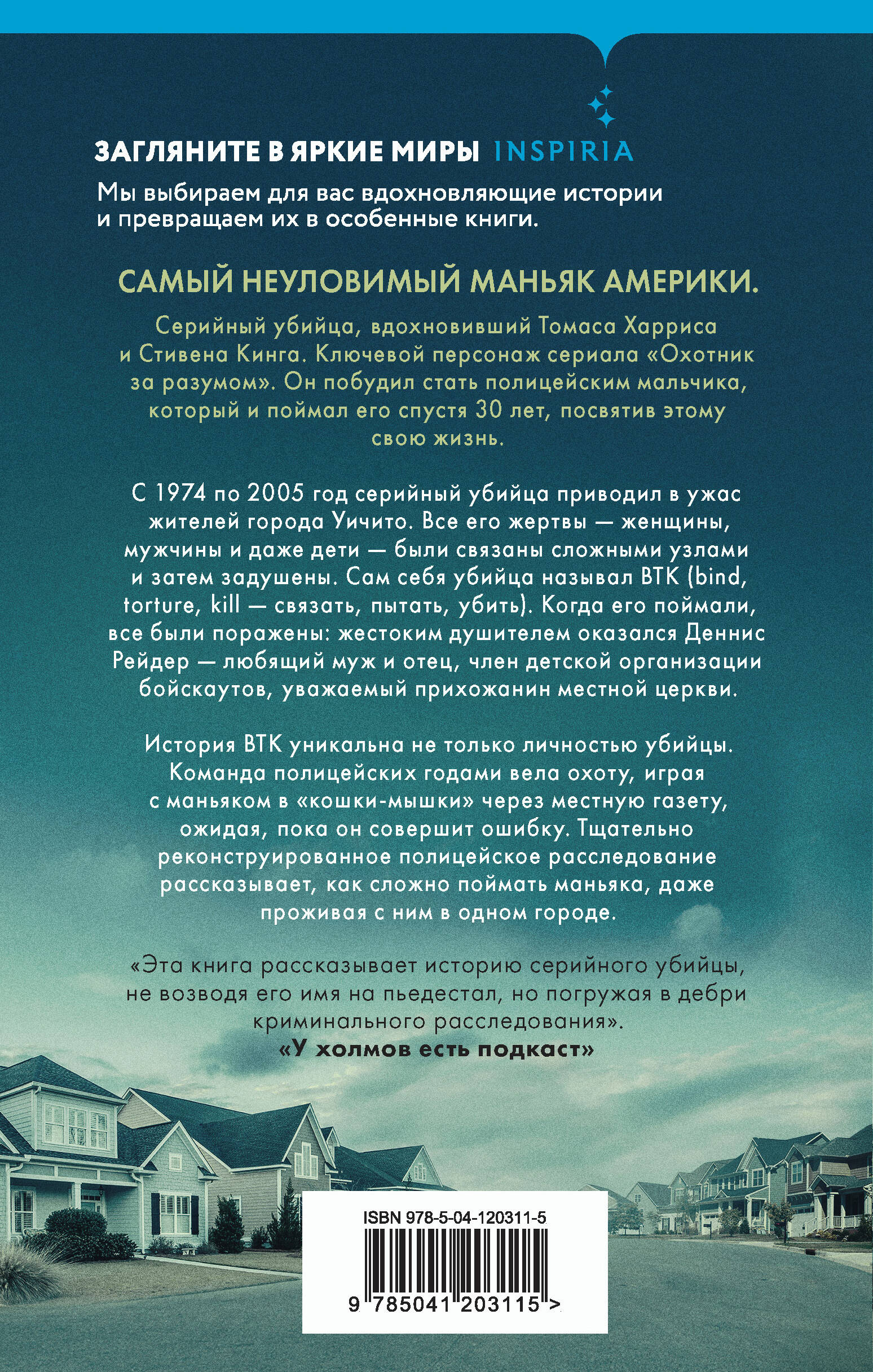 Его история поражает воображение. Самый неуловимый маньяк Америки. Серийный убийца, вдохновивший Томаса Харриса и Стивена Кинга. Ключевой персонаж сериала «Охотник за разумом». Он побудил стать полицейским мальчика, который и поймал его спустя 30 лет, посвятив этому свою жизнь. На протяжении трех десятилетий с 1974 по 2005 жестокий серийный убийца приводил в ужас жителей города Уичито, штат Канзас. Все его жертвы - женщины, мужчины и даже дети - были связаны сложными узлами и затем задушены. Сам себя убийца называл BTK (bind, torture, kill - связать, пытать, убить). Под этим прозвищем он годами терроризировал округу и наслаждался перепиской с полицией через местную газету. Когда его наконец поймали, все были поражены: жестоким садистом и душителем оказался Деннис Рейдер - любящий муж и отец, член детской организации бойскаутов, уважаемый прихожанин местной церкви. История BTK уникальна не только личностью маньяка. В 1970-х, когда начались первые громкие убийства душителя, Кенни Ландвер был местным подростком. Впечатлительный мальчик захотел стать полицейским, чтобы охотиться на таких вот убийц и подонков. Никто и не подозревал, что именно он спустя 30 лет поймает BTK, посвятив этому делу всю свою профессиональную жизнь. Ландвер годами играл с маньяком в «кошки-мышки», ожидая, пока тот совершит ошибку. Тщательно реконструированное полицейское расследование, лежащее в основе книги, рассказывает, как сложно поймать серийного убийцу, даже проживая с ним в одном городе.