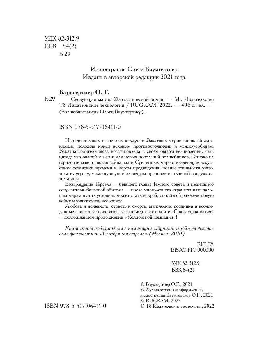 Народы темных и светлых колдунов Закатных миров вновь объединились, положив конец вековым противостояниями и междоусобицам. Закатная обитель была восстановлена в своем былом великолепии, став цитаделью знаний и магии для новых поколений волшебников. Однако на горизонте маячит новая война: маги Срединных миров, владеющие искусством остановки времени и даром предвидения, полны решимости уничтожить угрозу, мелькнувшую в зловещем пророчестве главной предсказательницы. Возвращение Тэрсела - бывшего главы Темного совета и нынешнего соправителя Закатной обители - после многолетнего странствия по дальним мирам в этих условиях может стать искрой, способной разжечь новую войну и уничтожить все живое. Любовь и ненависть, страсть и смерть, магические поединки и неожиданные сюжетные повороты, всё это ждет вас в книге «Связующая магия» - долгожданном продолжении «Колдовской компании»! Книга стала победителем в номинации «Лучший герой» на фестивале фантастики «Серебряная стрела» (Москва, 2010).| Издательство | Т8 RUGRAM |