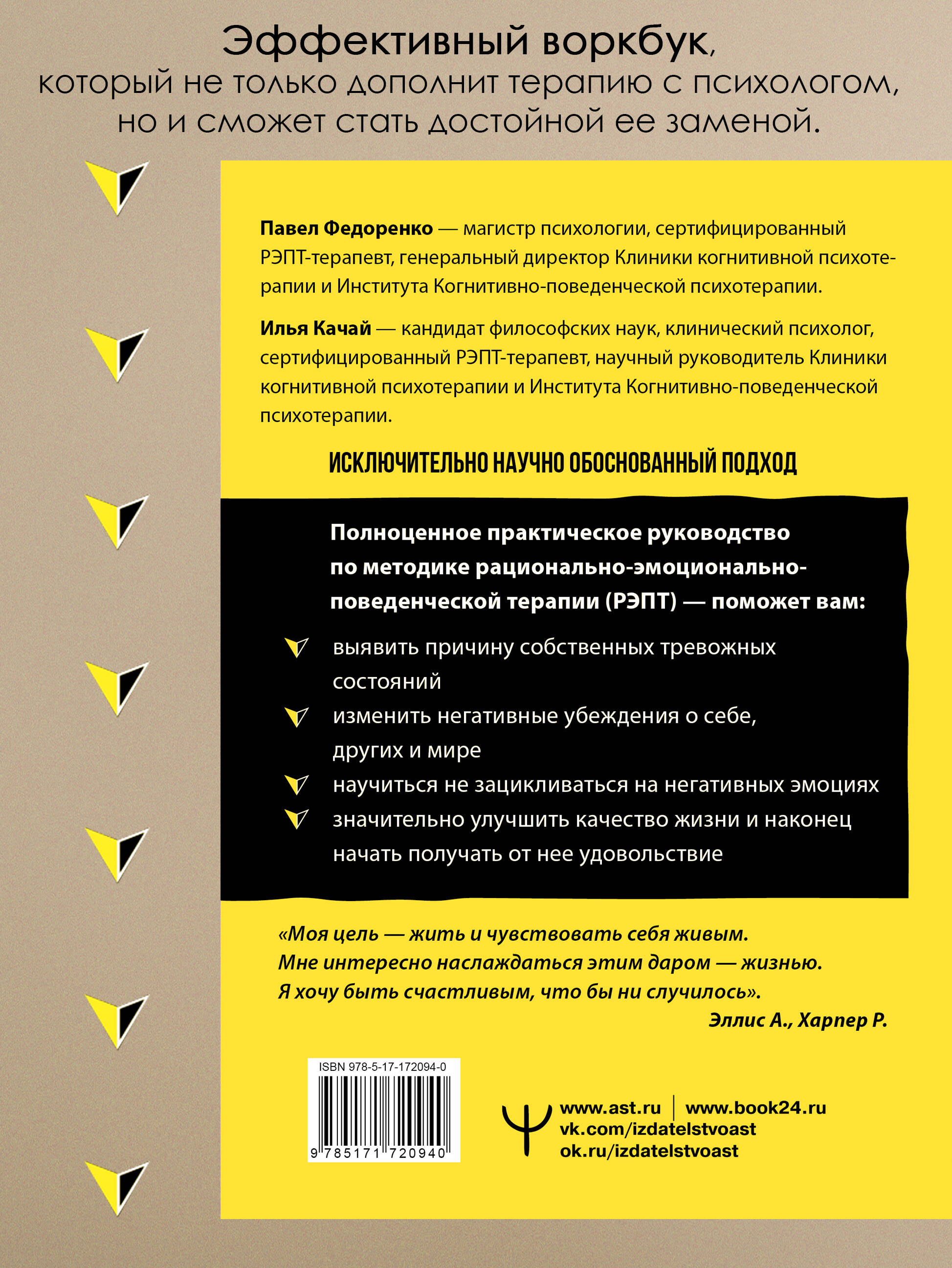 Павел Федоренко - магистр психологии, сертифицированный КПТ- и РЭПТ-терапевт, генеральный директор Клиники когнитивной психотерапии, генеральный директор Института Когнитивно-поведенческой психотерапии, основатель Академии здорового мышления. Илья Качай - кандидат философских наук, клинический психолог, сертифицированный КПТ- и РЭПТ-терапевт, научный руководитель Клиники когнитивной психотерапии, научный руководитель Института Когнитивно-поведенческой психотерапии, доцент кафедры философии Сибирского федерального университета. Хотите научиться справляться с тревожными состояниями, не зацикливаться на негативных эмоциях и легко переключать психику в режим спокойствия? Воркбук по рационально-эмоционально-поведенческой терапии (РЭПТ) от опытных психотерапевтов и авторов бестселлеров Павла Федоренко и Ильи Качая станет ценным помощником в достижении ваших целей. Благодаря этому практическому инструменту, в основе которого лежат проверенные упражнения и техники, вы избавитесь от тревог, страхов, переживаний и негативных установок, научитесь управлять эмоциями, тем самым значительно повысите качество жизни и наконец начнете получать от нее удовольствие. Многолетняя практика по методике РЭПТ позволила авторам создать эффективный воркбук, который не только дополнит терапию с психологом, но и сможет стать достойной ее заменой. Теоретической основой воркбука являются принципы рационально-эмоционально-поведенческой терапии, которая была разработана А. Эллисом в середине прошлого века, но до сих остается крайне востребованной в силу своей краткосрочности и эффективности. Приемы этой терапии помогут вам самостоятельно: • выявить причину собственных тревожных состояний; • изменить негативные убеждения о себе, других и мире; • научиться не зацикливаться на негативных эмоциях; • значительно улучшить качество жизни и наконец начать получать от нее удовольствие.| Издательство | Издательство "АСТ" |