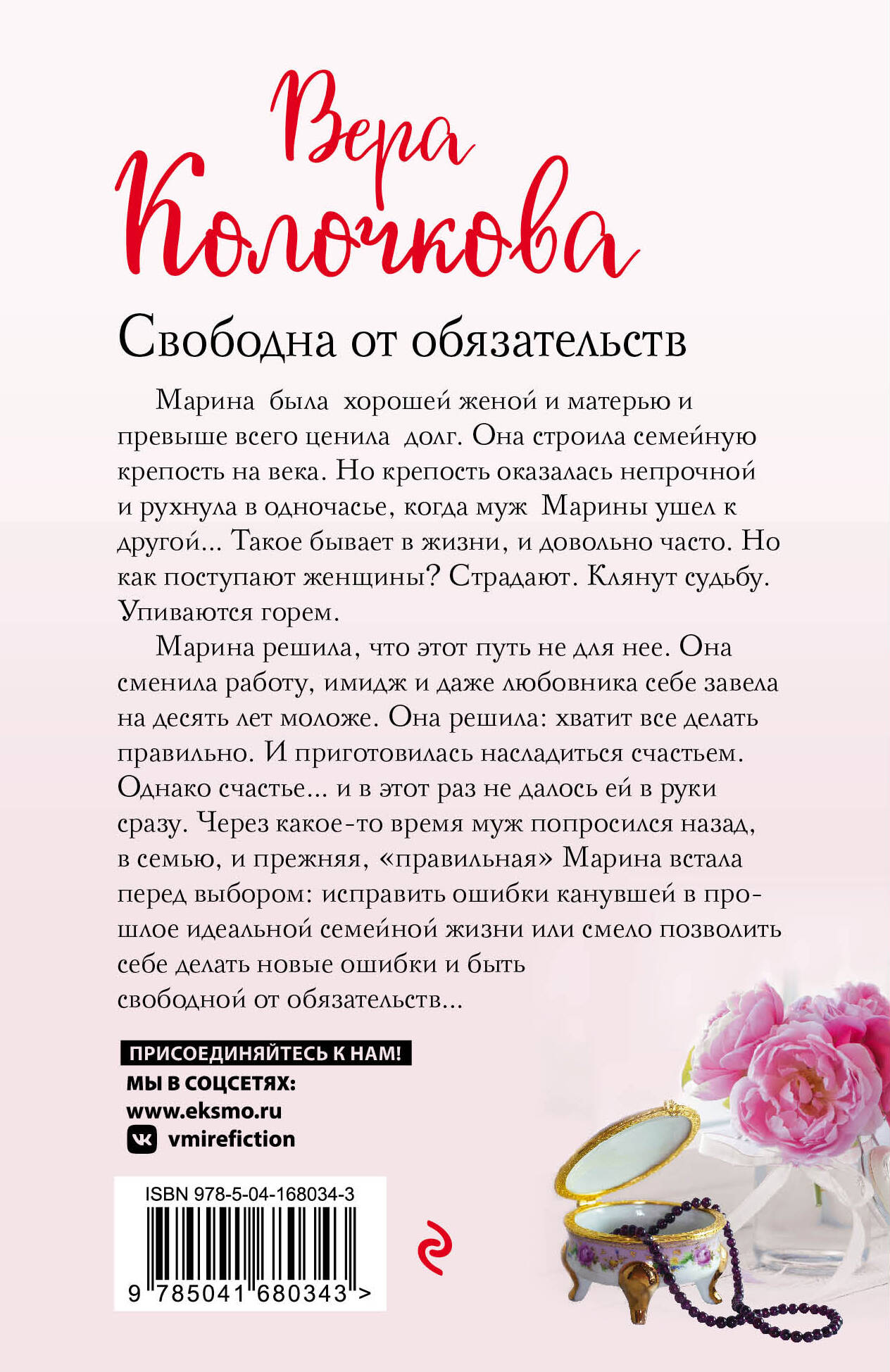 Самое главное в серии «Уютный роман» - это возможность закутаться в новую историю, как в теплый плед, и приятно провести свой свободный вечер. Тиражи раскупаются уже за первые недели продаж! Успейте ухватить себе кусочек уюта! Марина была хорошей женой и матерью и превыше всего ценила долг. Она строила семейную крепость на века. Но крепость оказалась непрочной и рухнула в одночасье, когда муж Марины ушел к другой… Такое бывает в жизни, и довольно часто. Но как поступают женщины? Страдают. Клянут судьбу. Упиваются горем. Марина решила, что этот путь не для нее. Она сменила работу, имидж и даже любовника себе завела на десять лет моложе. Она решила: хватит все делать правильно. И приготовилась насладиться счастьем. Однако счастье… и в этот раз не далось ей в руки сразу. Через какое-то время муж попросился назад, в семью, и прежняя, «правильная» Марина встала перед выбором: исправить ошибки канувшей в прошлое идеальной семейной жизни или смело позволить себе делать новые ошибки и быть свободной от обязательств…| Издательство | Эксмо |