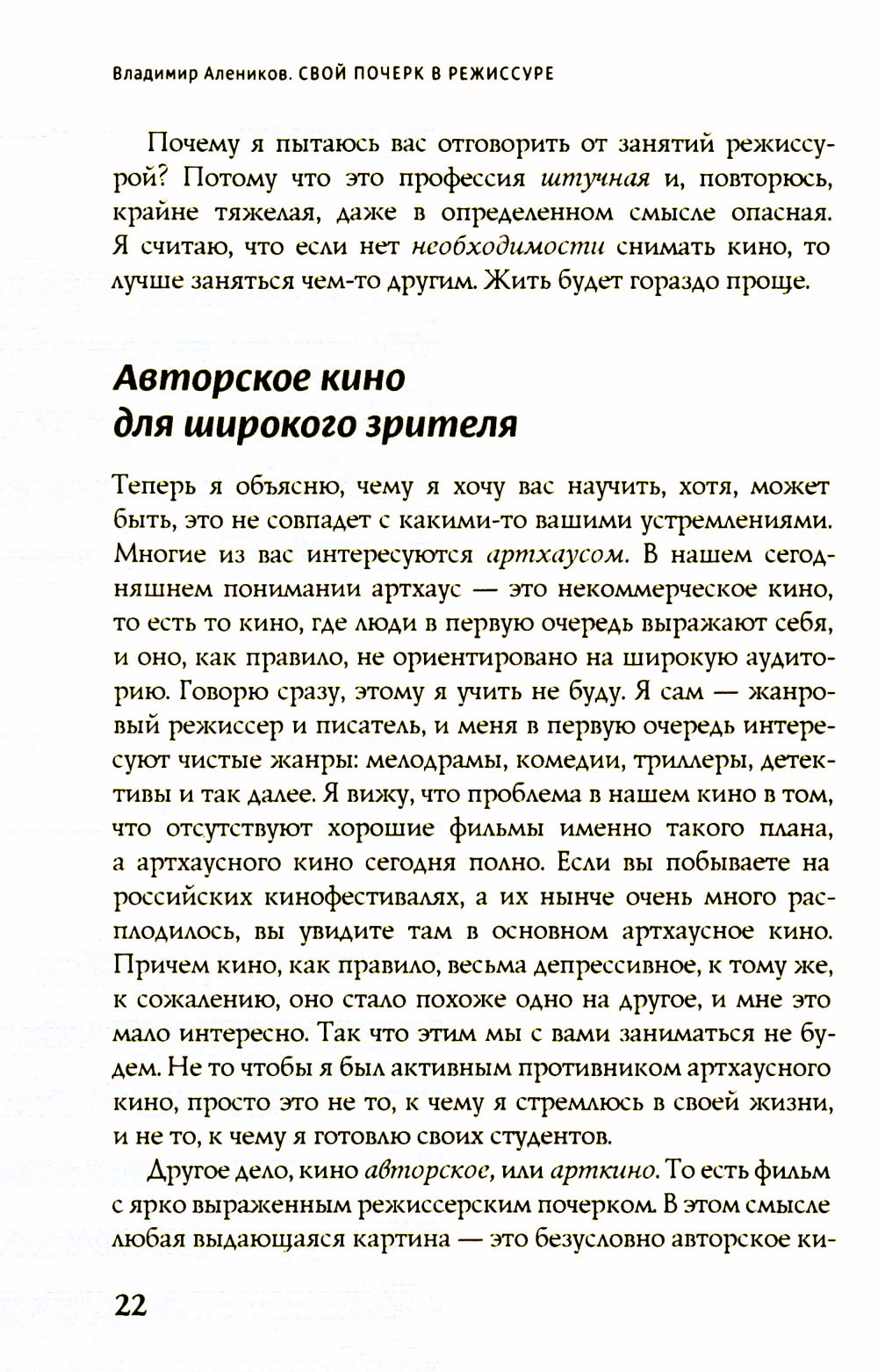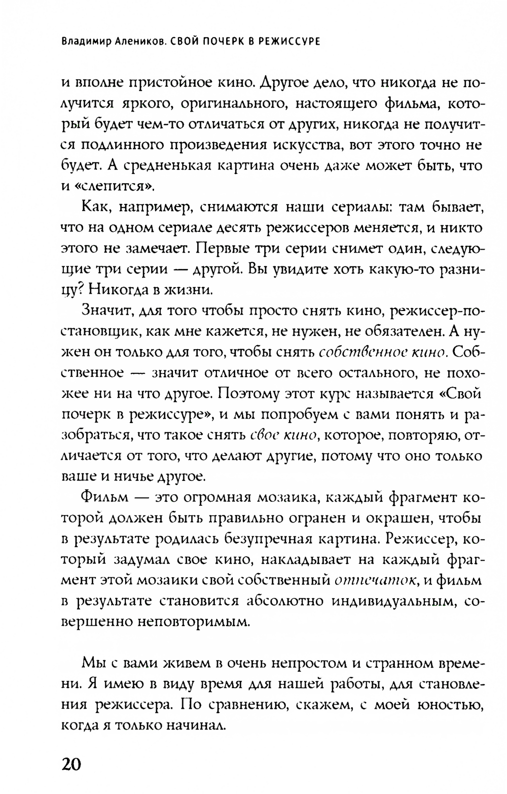 Владимир Алеников - один из лучших режиссеров отечественного кино, писатель, киносценарист и продюсер. Постановщик знаменитых фильмов «Приключения Петрова и Васечкина», «Биндюжник и Король», «Улыбка Бога, или Чисто одесская история», «Война Принцессы» и многих других. В течение нескольких лет он был профессором кинорежиссуры Лос-Анджелесского университета. Сейчас руководит режиссерскими мастерскими на Высших курсах кино и телевидения ВГИК и на Высших курсах сценаристов и режиссеров, а также ведет спецкурсы в киношколе «Артерия кино» и в Киноакадемии Никиты Михалкова.| Издательство | Рипол Классик |
