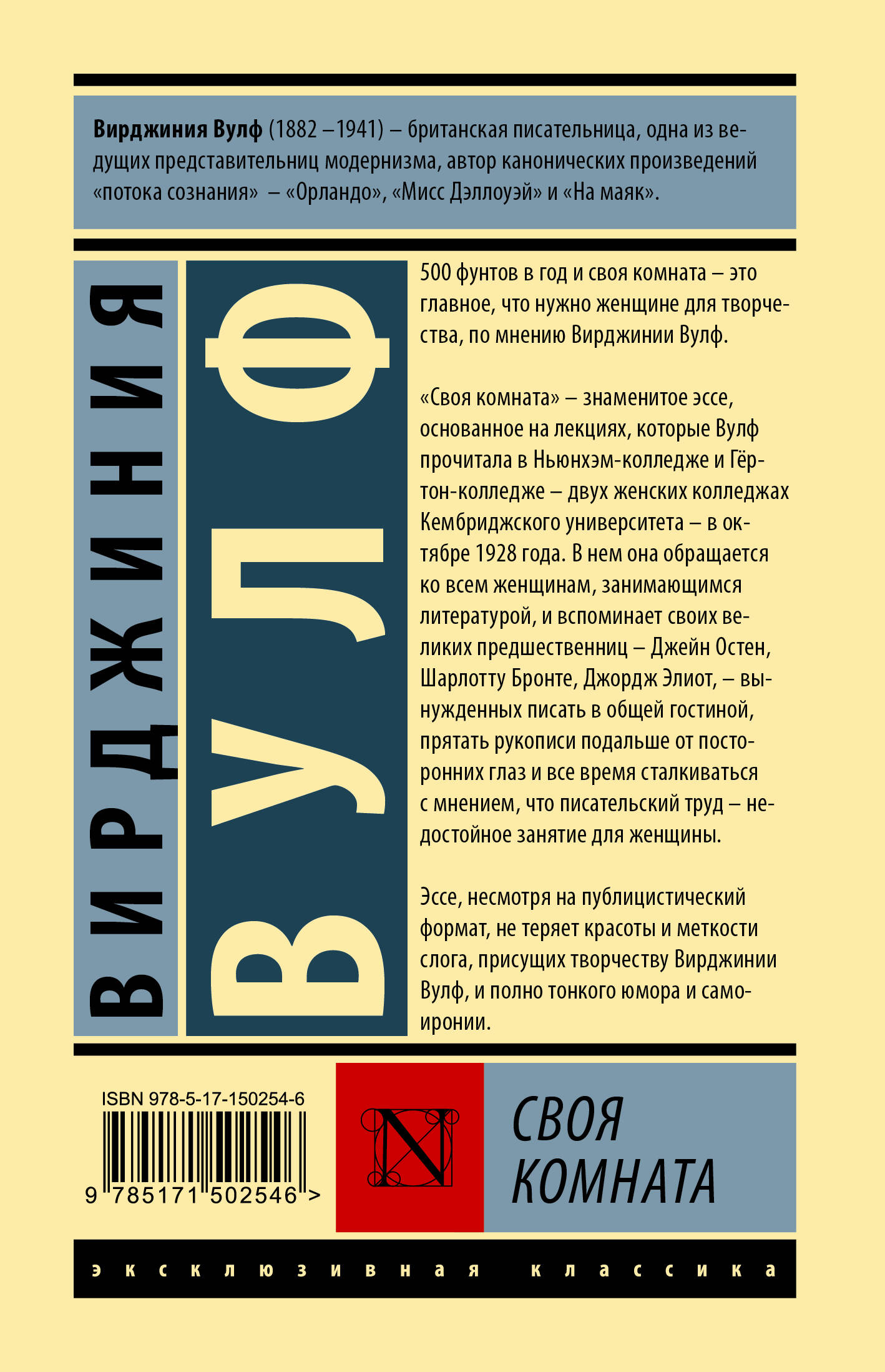 500 фунтов в год и своя комната - это главное, что нужно женщине для творчества, по мнению Вирджинии Вулф. "Своя комната" - знаменитое эссе, основанное на лекциях, которые Вулф прочитала в Ньюнхэм-колледже и Гёртон-колледже - двух женских колледжах Кембриджского университета - в октябре 1928 года. В нем она обращается ко всем женщинам, занимающимся литературой, и вспоминает своих великих предшественниц - Джейн Остен, Шарлотту Бронте, Джордж Элиот, - вынужденных писать в общей гостиной, прятать рукописи подальше от посторонних глаз и все время сталкиваться с мнением, что писательский труд - недостойное занятие для женщины. Эссе, несмотря на публицистический формат, не теряет красоты и меткости слога, присущих творчеству Вирджинии Вулф, и полно тонкого юмора и самоиронии.| Издательство | АСТ |