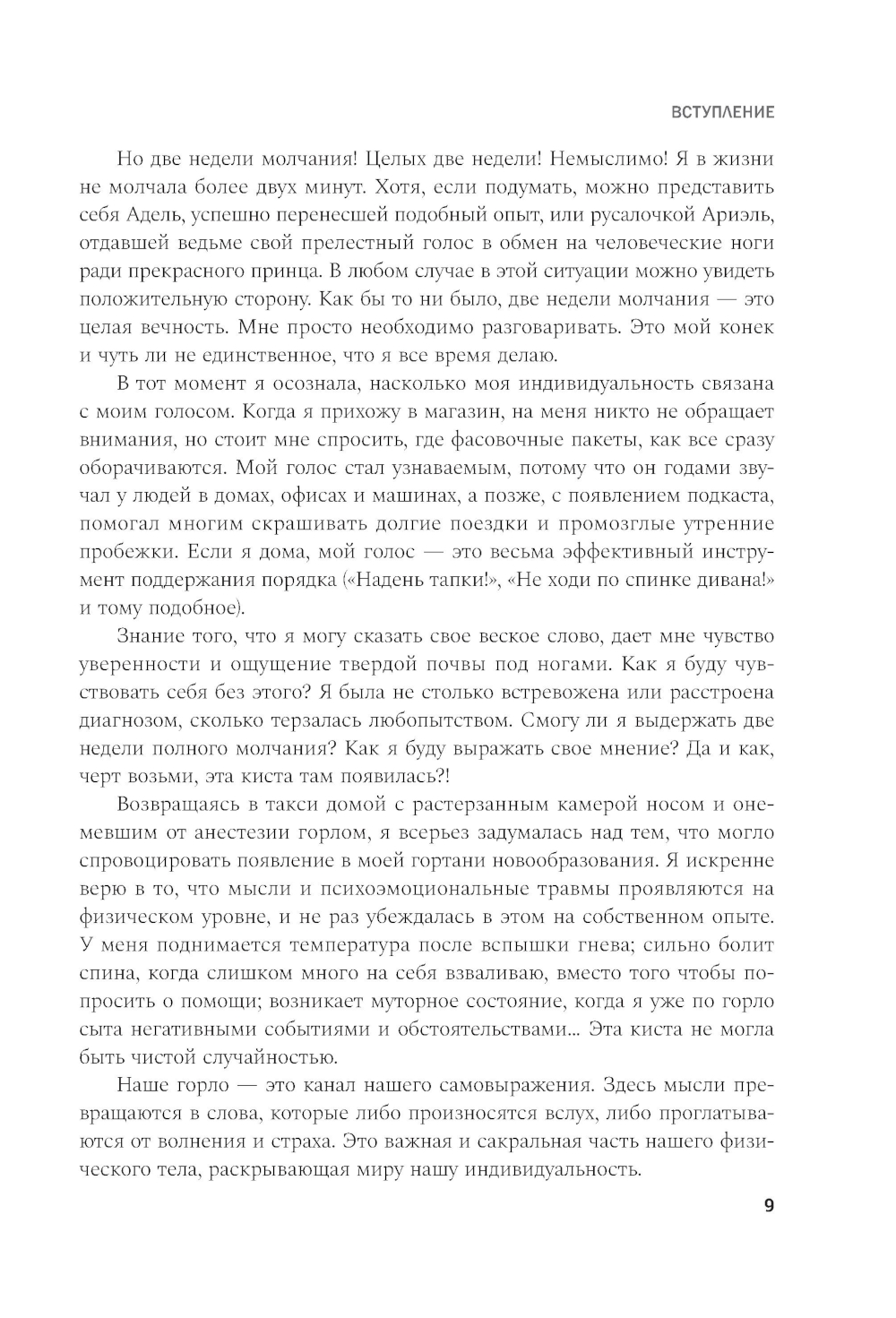 Голос Ферн Коттон слышали миллионы, будь то по телевизору, радио или на ее популярном подкасте Happy Place. Голос - это ее работа, источник дохода и возможность общаться со своей аудиторией и близкими по духу людьми. Поэтому, когда врачи сказали Ферн, что ей может понадобиться операция на гортани, после которой она две недели не сможет говорить, это навело ее на неожиданные и весьма серьезные раздумья. Размышляя о перспективе молчания, Ферн стала вспоминать другие ситуации, когда ее голос оставался неуслышанным на фоне других, более громких и доминирующих голосов. Она стала задаваться вопросами. Когда мы перестаем говорить то, что думаем и чувствуем? Когда мы начинаем наступать себе на горло? Почему мы предпочитаем молчать в угоду кому-то ценой собственного душевного благополучия и счастья? В этой смелой, откровенной и глубоко личной книге Ферн дает ответы на подобные вопросы, делится своей убедительной историей и рассказывает, как найти собственный голос и уверенно им пользоваться.