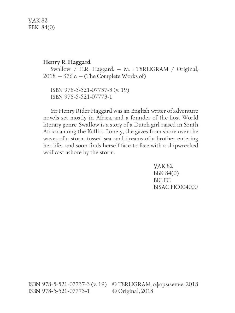 Sir Henry Rider Haggard was an English writer of adventure novels set mostly in Africa, and a founder of the Lost World literary genre. Swallow is a story of a Dutch girl raised in South Africa among the Kaffirs. Lonely, she gazes from shore over the waves of a storm-tossed sea, and dreams of a brother entering her life... and soon finds herself face-to-face with a shipwrecked waif cast ashore by the storm.| Издательство | Т8 RUGRAM |