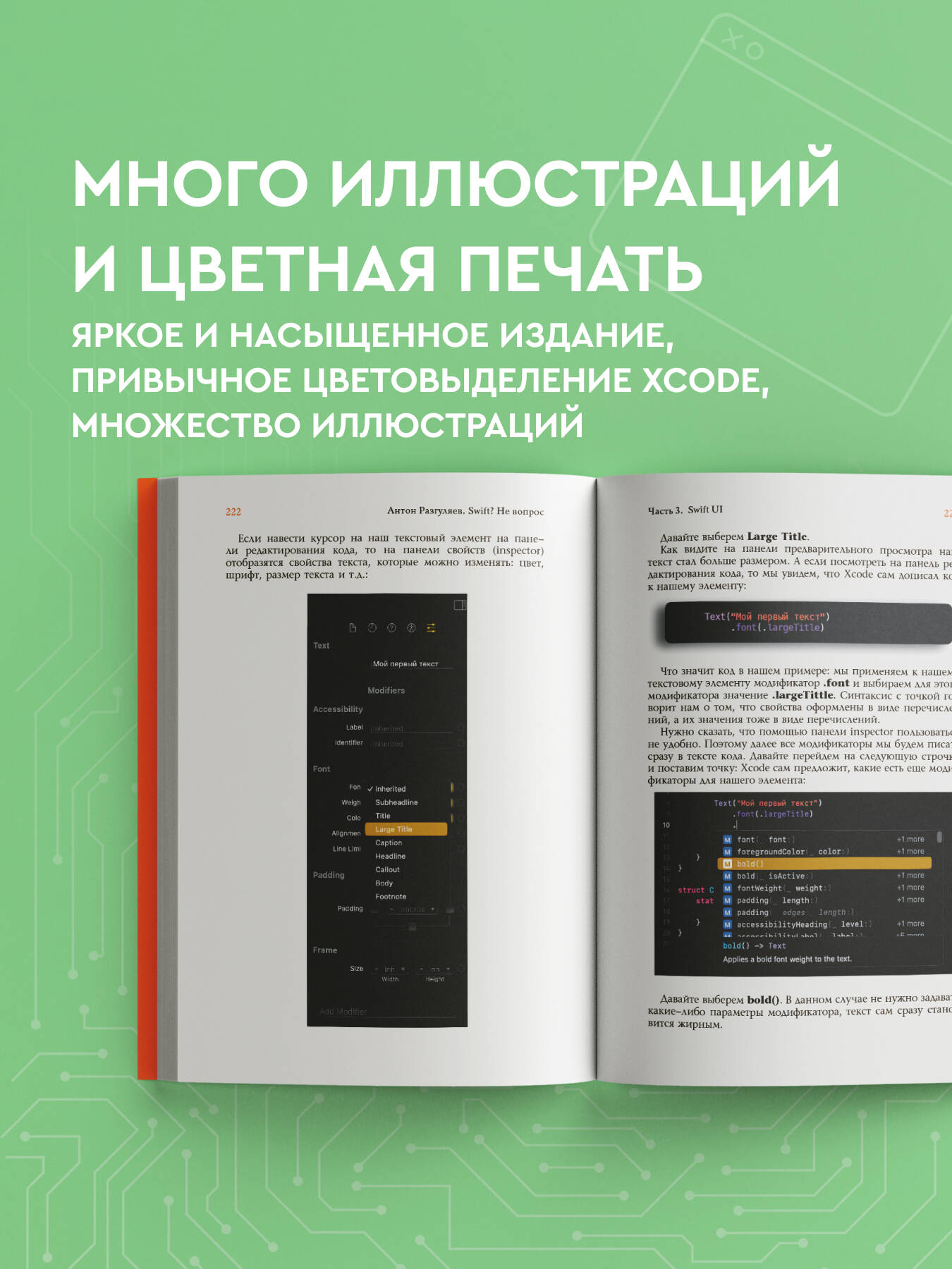 SWIFT - собственный язык программирования Apple, представленный в 2014 году. За 10 лет эволюции Swift стал полностью интегрирован во все устройства Apple. На нем написаны LinkedIn, Airbnb, Kickstarter, Slack, Firefox, Uber и многие другие топовые приложения. Все iOS-версии кроссплатформенных мессенджеров и социальных сетей, которыми мы пользуемся, написаны с использованием Swift. Антон Разгуляев - опытный разработчик, издатель собственных приложений в AppStore, энтузиаст и ментор, собрал самое важное и актуальное для изучения Swift и SwiftUI с нуля. Книга "SWIFT? НЕ ВОПРОС" проведет вас от самых основ программирования до написания настоящего приложения. Вы не просто изучите теорию, но и на каждом шаге будете выполнять практические задачи, которые приведены в каждой главе вместе с решениями для самопроверки. ЕСЛИ ПРОФЕССИЯ - ТО ПРОГРАММИСТ ЕСЛИ ЯЗЫК - ТО SWIFT| Издательство | Издательство "АСТ" |